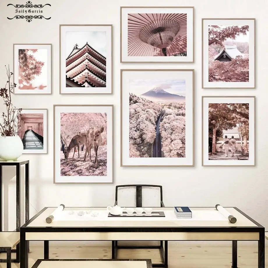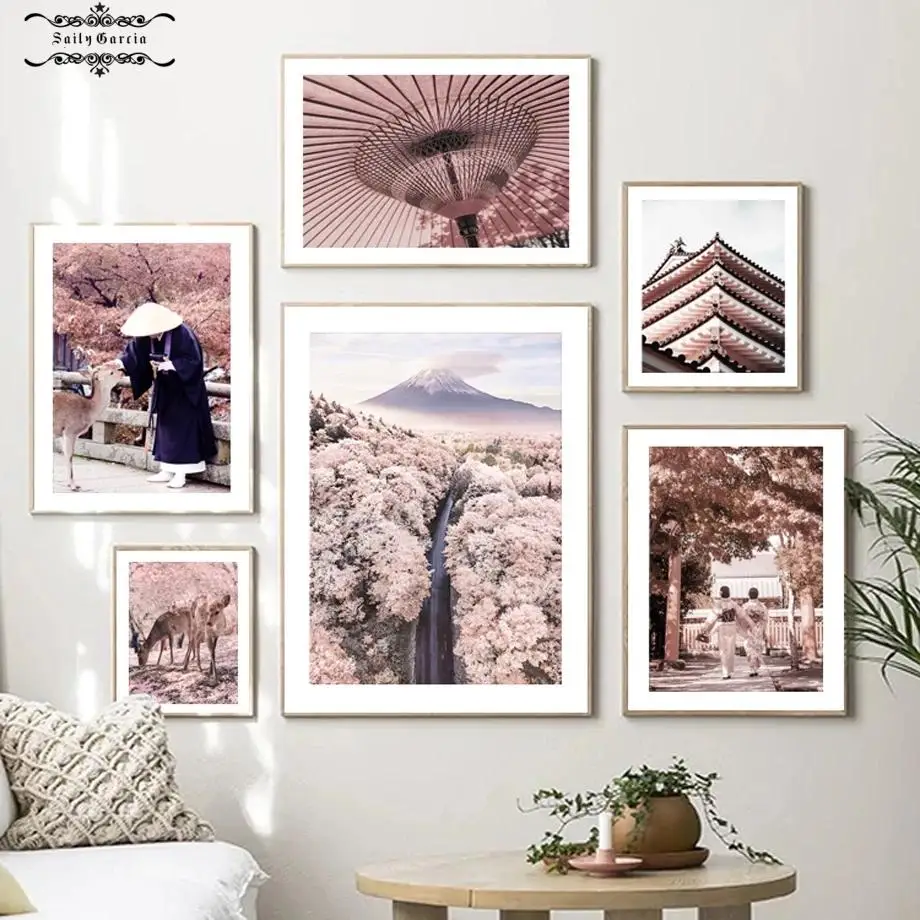 Японские архитекторы, пейзаж, постер, олень, Сакура, холст, живопись, кленовый лист, гора, Fuji, настенное искусство, монах, кимоно, картины, Декор