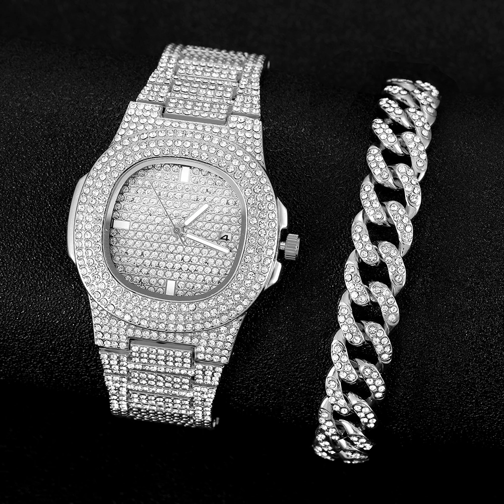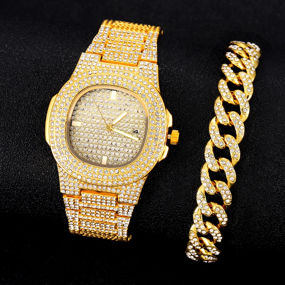 Часы наручные для мужчин и женщин, Роскошные Кварцевые золотистые часы в стиле хип-хоп, с браслетом и кубинской цепью, 2021