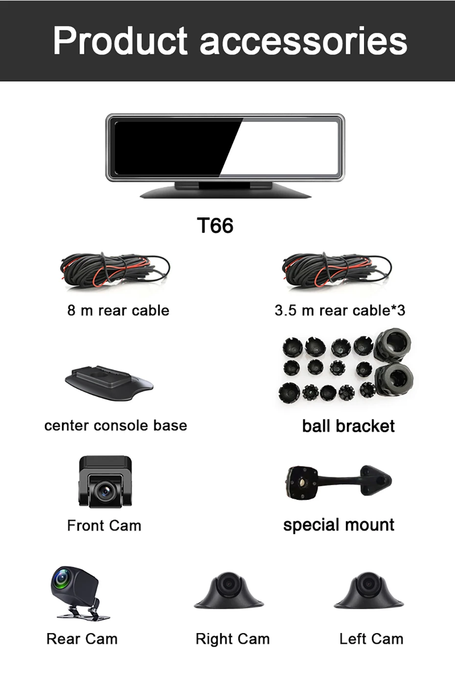 Панорамный видеорегистратор для приборной панели, 360 , 12-дюймовый сенсорный экран, зеркало заднего вида, 4-канальный видеорегистратор, 4 фотокамеры