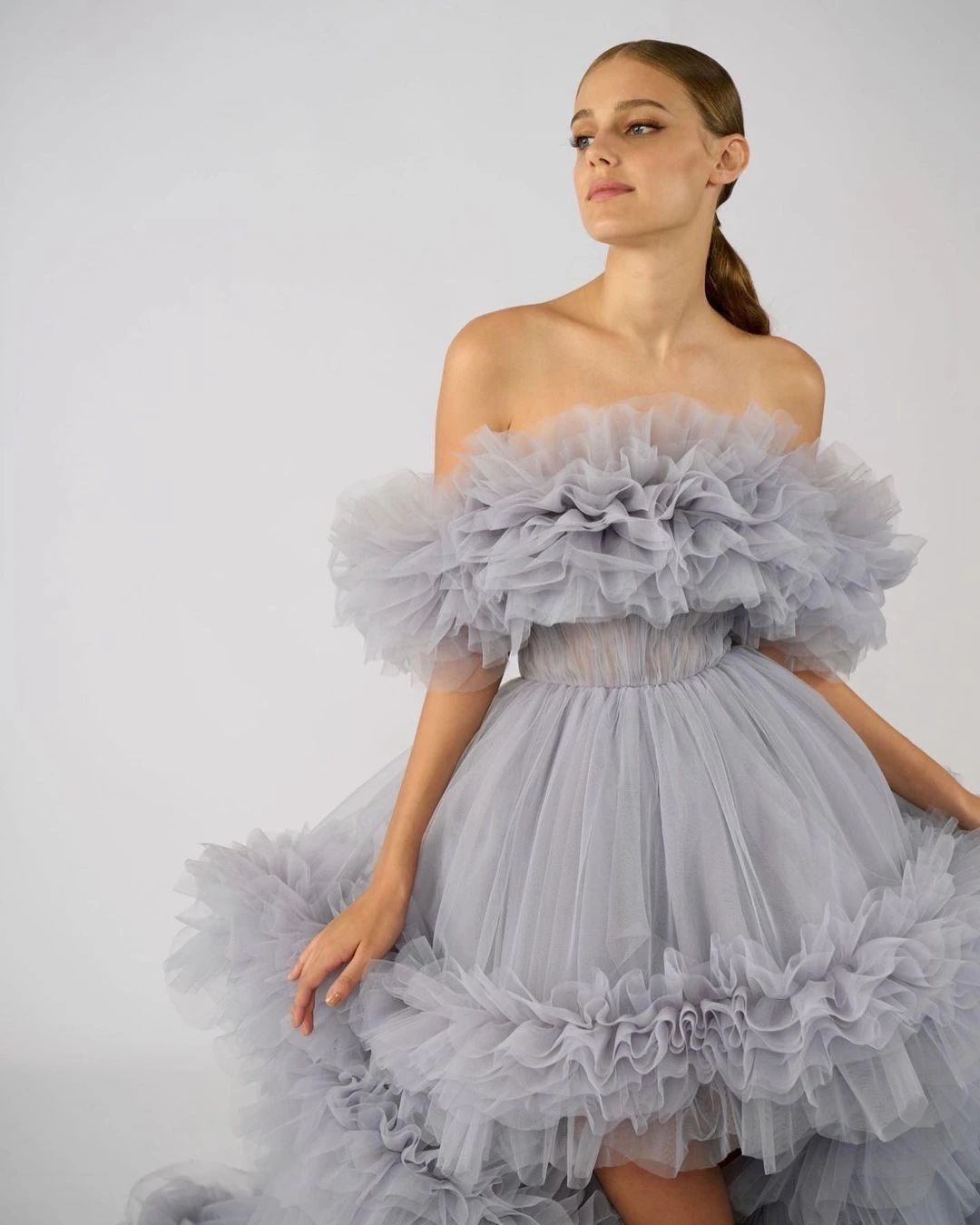 Великолепное серое Тюлевое платье, платья для выпускного вечера, платья с открытыми плечами, высокими и низкими оборками, многослойные вечерние платья, платье для фотосессии на день рождения