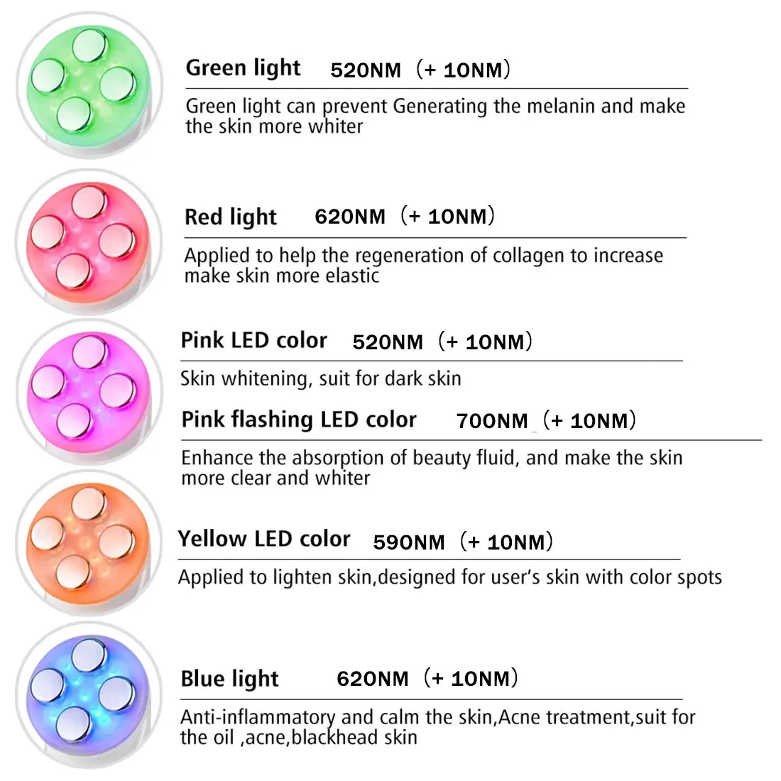 Выберите модель и функцию: Красный светильник с длиной волны: 620нм (+ 1Onm), ускоряет кровообращение, стимулируя активность клеток кожи Зеленый светильник длиной волны: 520нм (+ 1Onm), подавляет чрезмерное производство меланина, делает кожу более мягкой Синий светильник Длина волны: 62Onm (+ 1Onm), противовоспалительный, успокаивающий, тонкие поры, подходит Подходит для акне или жирной кожи Желтый светильник Длина волны: 59Onm (+ 10 нм), осветляет тон кожи, подходит для людей с брызгами и темной кожей Розовый светильник длиной волны: 70 нм (+ 10 нм), отбеливающая кожа, подходит для темной кожи Длина волны розовой вспышки: 70 Onm (+ 1 Onm), для увеличения проникновения косметического лосьона или геля