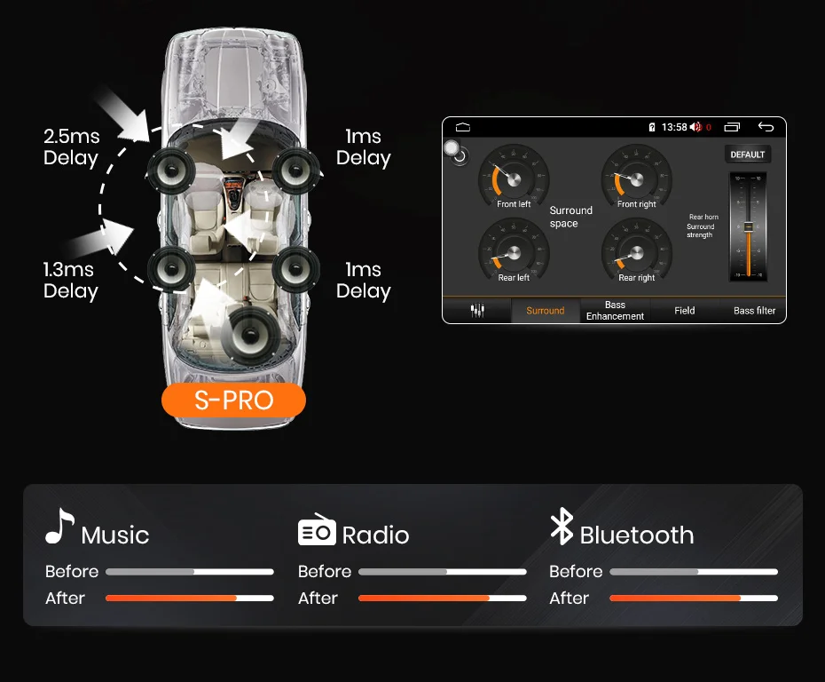 Благодаря встроенному усилению 4*45 Вт музыка звучит очень четко даже при высоких объемах.Вы можете настроить звук для ваших личных предпочтений, с 9 графический эквалайзер: поп, рок, джаз, Классическая, без каблука, пользователя, голоса и т. д.Несколько вариантов настройки позволяют вам наслаждаться звуком лучше.