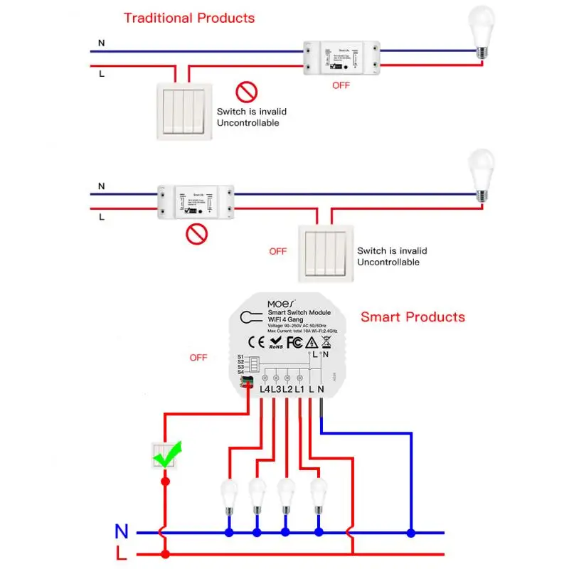 2,4-двойные выключатели поддерживает как особые требования к встретиться и новое обновление; Может использоваться в качестве 1-way или 2-полосная цепью повторного включения (2 переключателя управления 1 светильник); просто подключите к 1 из 2 переключателей и преобразуйте подключенное устройство в умный (Для детей возрастом от 2 way цепи); Мультиконтроль ассоциации используется как прежде всего каких-либо Gang кнопку, чтобы ваш Интеллектуальный переключатель Wi-Fi в приложение smart Life для другого интеллигентая (ый) управления.
