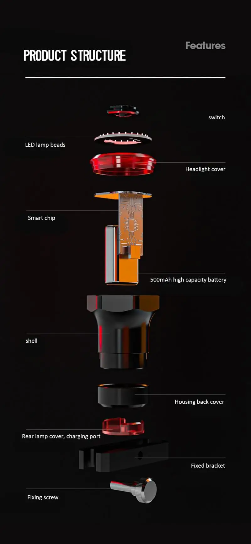 Работает на основе электромагнитной индукции от включения тормоза, Прямая зарядка с помощью разъема USB, интеллигентая (ый) светильник, светодиодный точечные лампы 24 ч Время работы от аккумулятора, IPX6 класс водонепроницаемости.