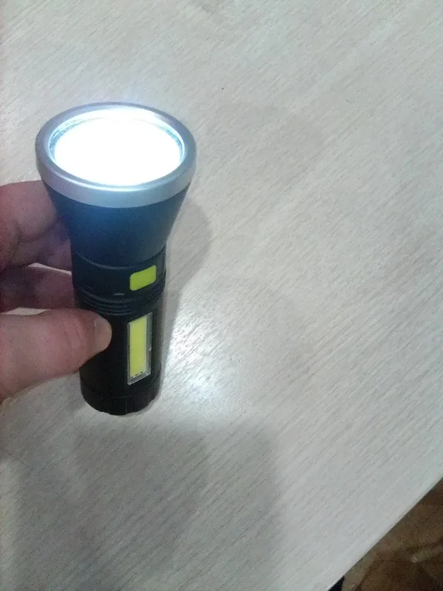 Фонарик очень лёгкий,пластмассовый.Заряжается через микро-Usb,шнур в комплекте,по яркости,как С8,и пятно такое же.Светит хорошо,но не так как заявлено.