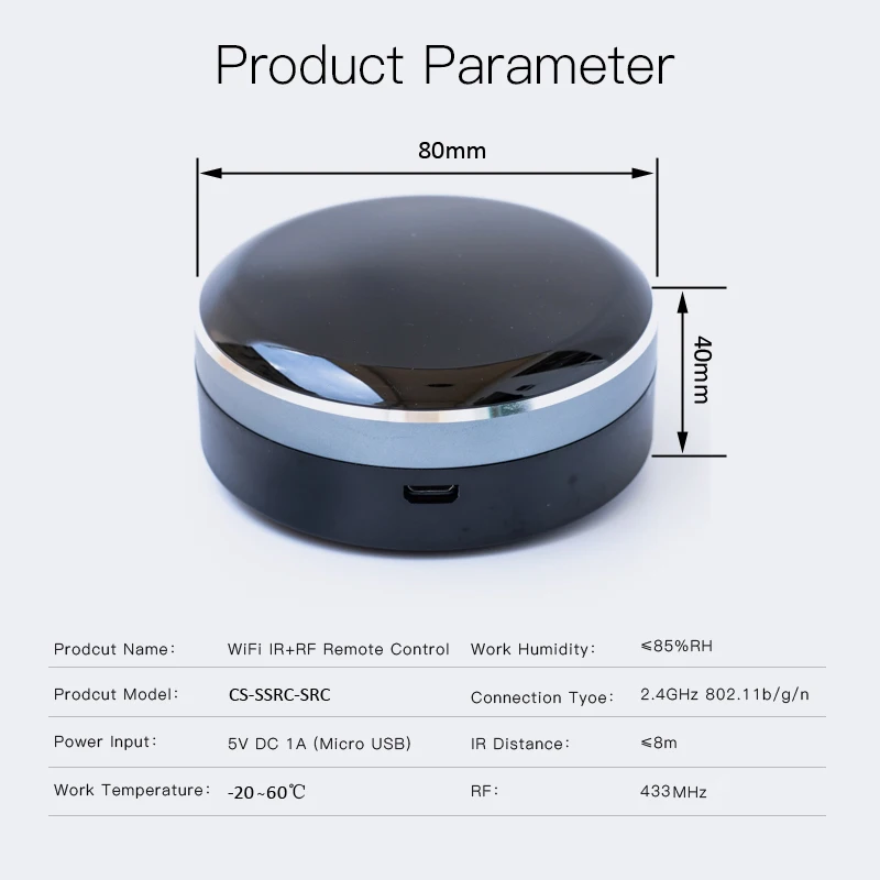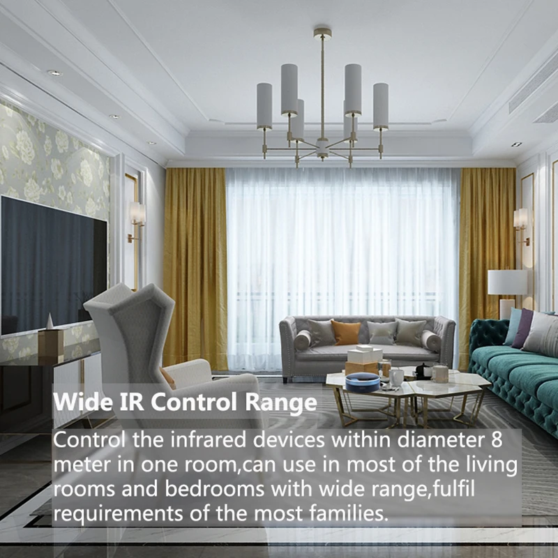 Управляйте инфракрасными бытовыми приборами в пределах 8 м в одной комнате, Управляйте радиочастотными бытовыми приборами в пределах 20 м, может использоваться в большинстве жилых комнат и спален.