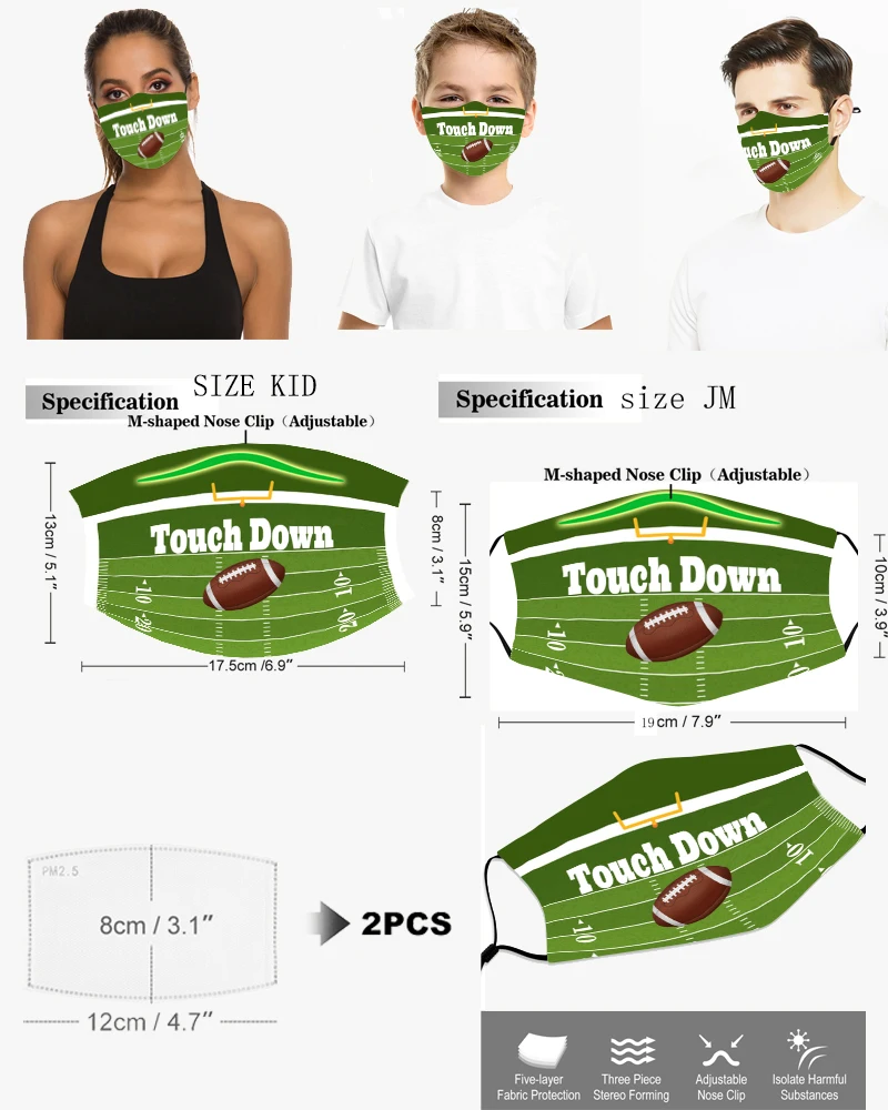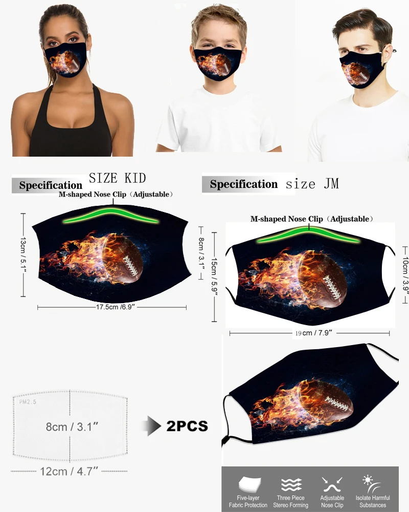 Регби футбольная серия маска для детей и взрослых моющаяся многоразовая маска для лица с 3d принтом цельная маска с 2 фильтрами тушь для ресниц