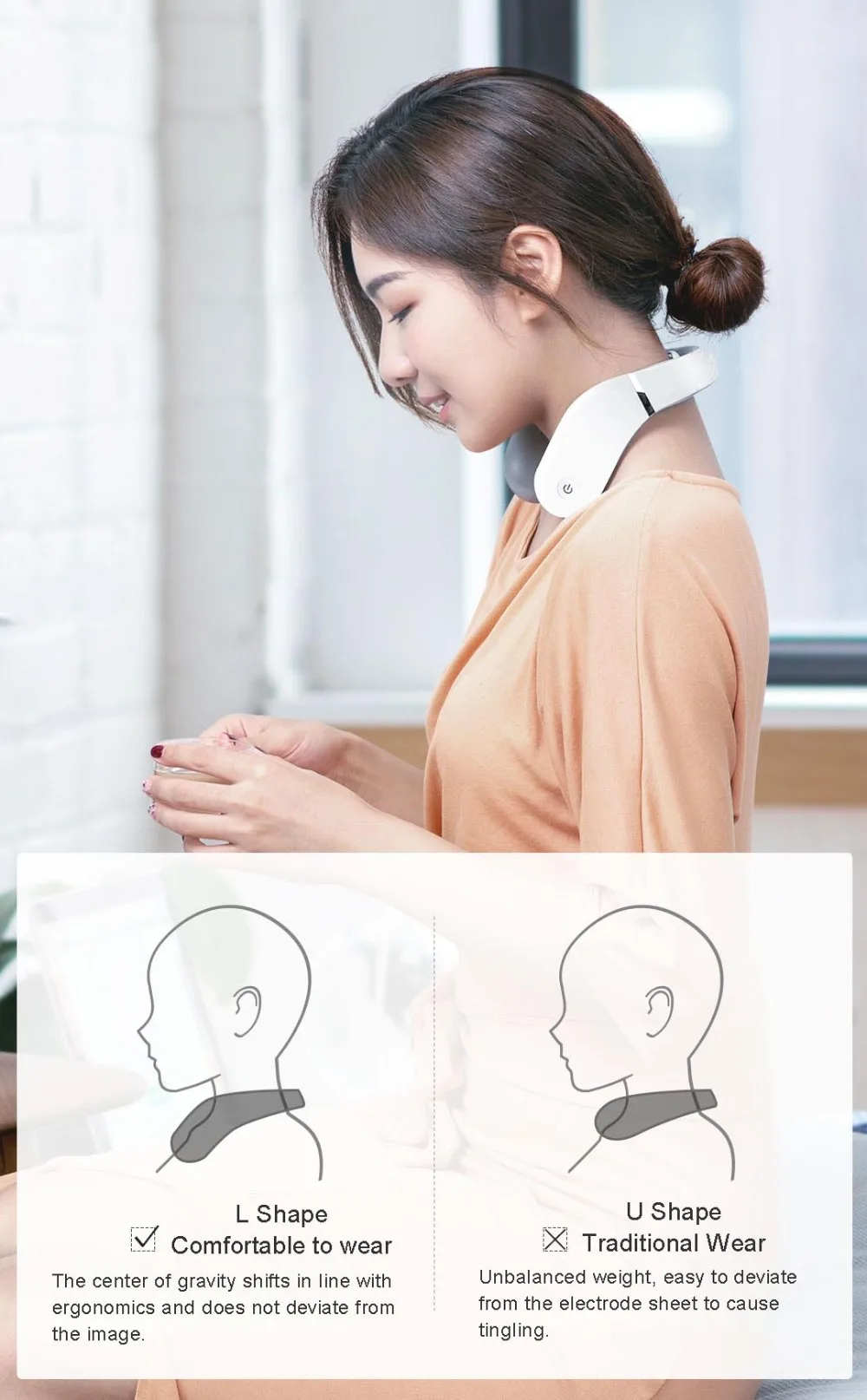 -L-образный передний конец опускает шею, чтобы подогнать ближе. Это не только предотвращает соскальзывание устройства, но и обеспечивает более плотное прилегание массажной части и шеи.