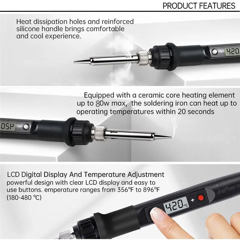 Этот паяльник-паяльник мощностью 80 Вт, который может работать при температуре 200-450 градусов Цельсия. Температура может быть скорректирована на 180-500 градусов Цельсия.