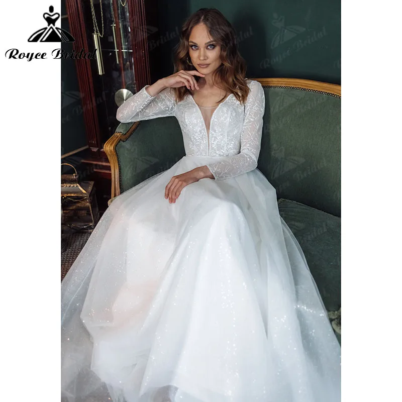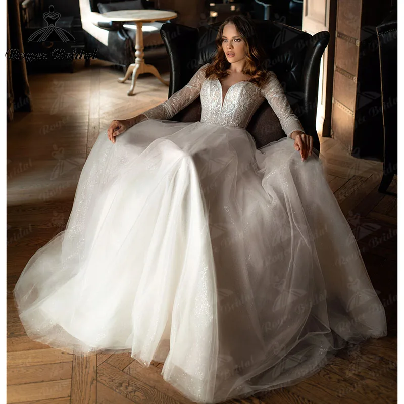 Пляжное свадебное платье с длинным рукавом и глубоким V-образным вырезом, блестящее кружевное платье с открытой спиной в стиле бохо, ТРАПЕЦИЕВИДНОЕ платье принцессы, Элегантное свадебное платье