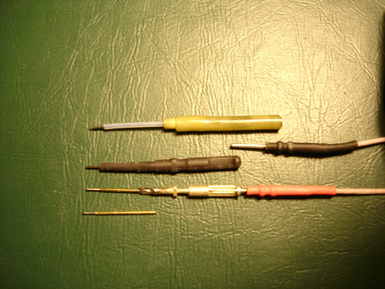 Взял контакты подороже - Р50-Q1, у них торцы с несколькими остриями, не соскальзывают с контактов микросхем с планарными выводами, кварца в корпусе "лодочка" и даже не соскальзывают при соединении двух контактов встречно торцами! Такого на иголках не точно получишь. Распаял переходники <пружинный контакт Р50-Q1>-<контакт "мама" (F) от разъема 2РМ> для подключения к щупам осциллографа, тестера и др. Контакт Р50 распаялся легко, без предварительного лужения, ход контакта после пайки не ухудшился. Сопротивление контактов (миллиомы) измерить не чем. На фото сверху-вниз -старый щуп из швейной иглы с контактом F от 2РМ -контакт Р50 с контактом F от 2РМ в термоусадке, рядом провод от тестера с ответным контактом М (папа) от 2РМ, -контакт Р50 с контактом F от 2РМ и подключенным проводом от тестера, -контакт Р50