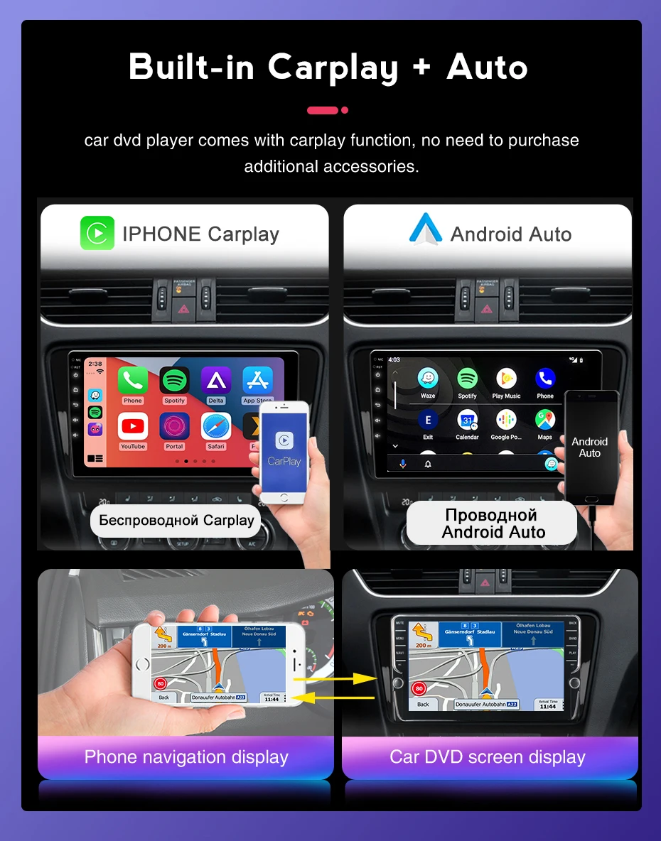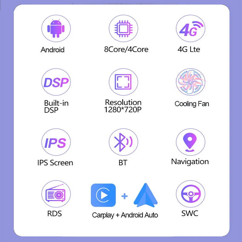 > Android 11 + API 29 + 9 дюймовый IPS экран + разрешение 1280*720 + Восьмиядерный + DDR4 8 Гб флэш + 128 ГБ памяти + беспроводная Carplay + Android Auto + DSP + оптический выход + коаксиальный выход + Алюминиевый теплоотвод + Встроенный вентилятор + встроенный Wifi + 4G LTE + gps-навигация + управление рулевым колесом + Bluetooth BT5.0 + Встроенный микрофон + Поддержка USB ADAS DVR Функция + Европейская DAB функция + 2K видео играть