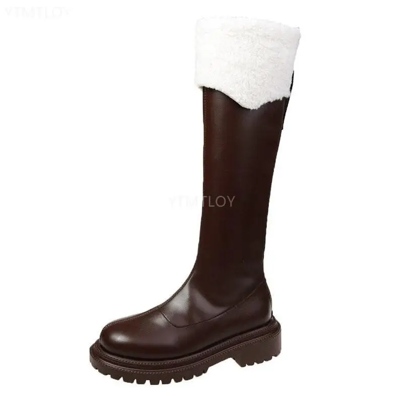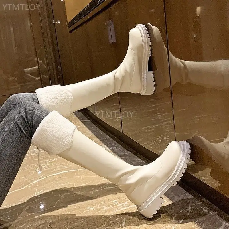 Женские повседневные сапоги до колена, бежевые или коричневые ковбойские сапоги из мягкой кожи на платформе, зимние Дизайнерские Длинные сапоги в стиле панк, 2022