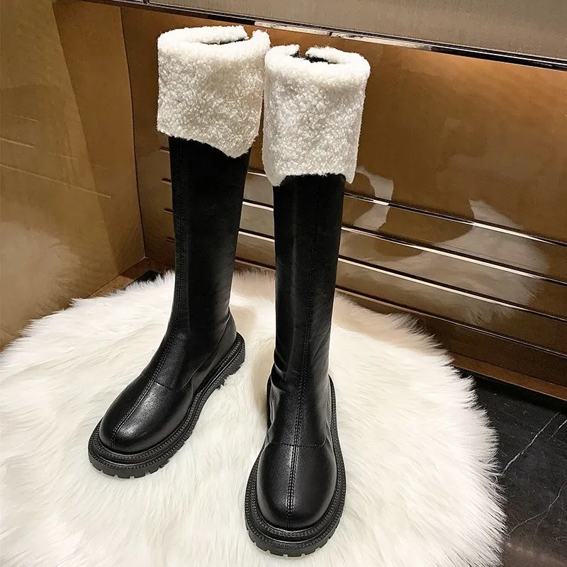 Зимние плюшевые сапоги до колена, женские черные кожаные боевые сап...