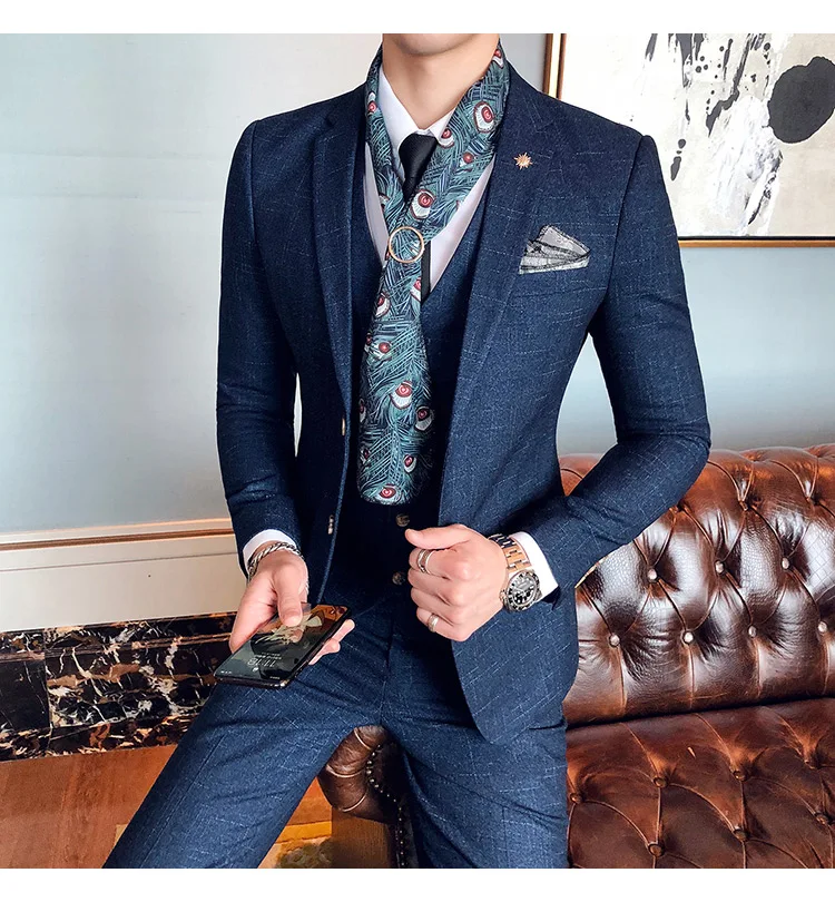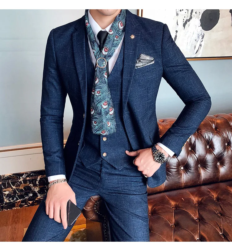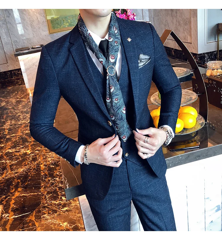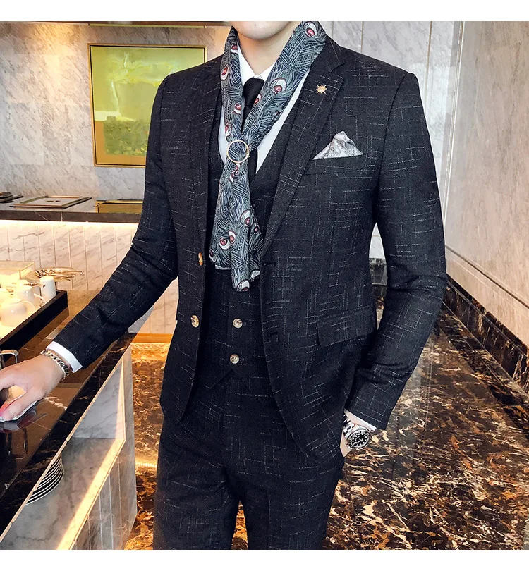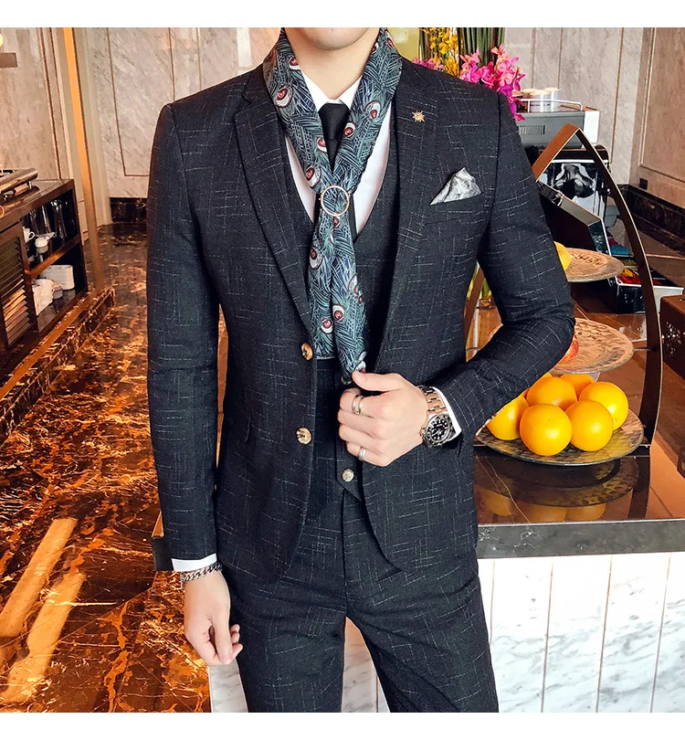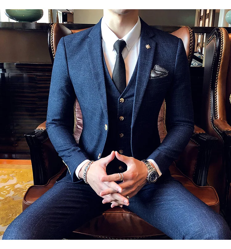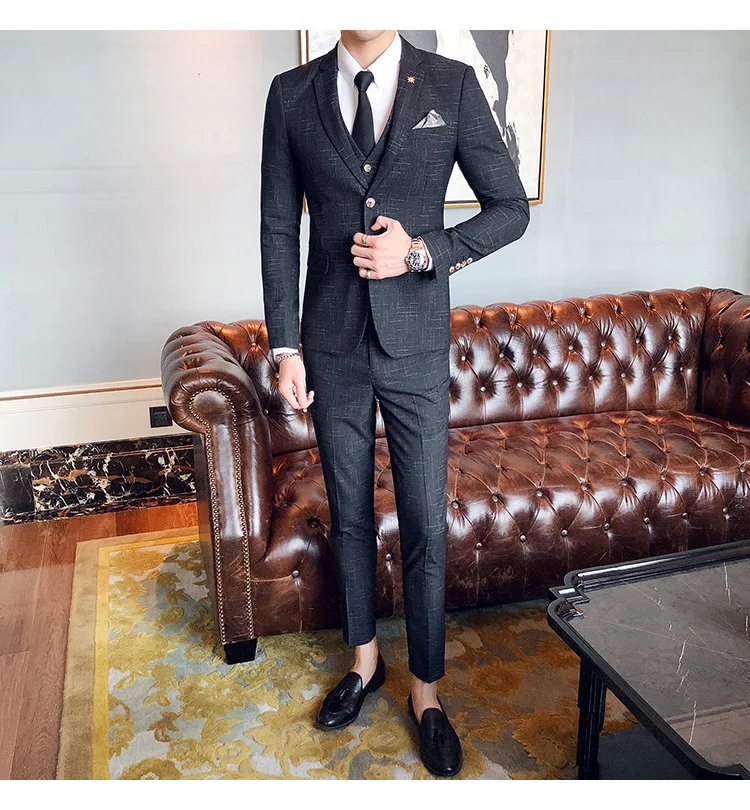 Классический мужской деловой костюм большого размера 7XL (Блейзер + жилет + брюки) для жениха, свадебное платье в темную клетку, в стиле ретро, деловой костюм из трех предметов