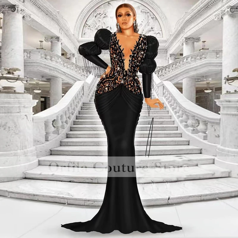 Сексуальное черное платье для выпускного вечера с длинным рукавом и блестками, кружевные атласные вечерние платья 2022 для Ближнего Востока, вечернее платье-макси с юбкой-годе