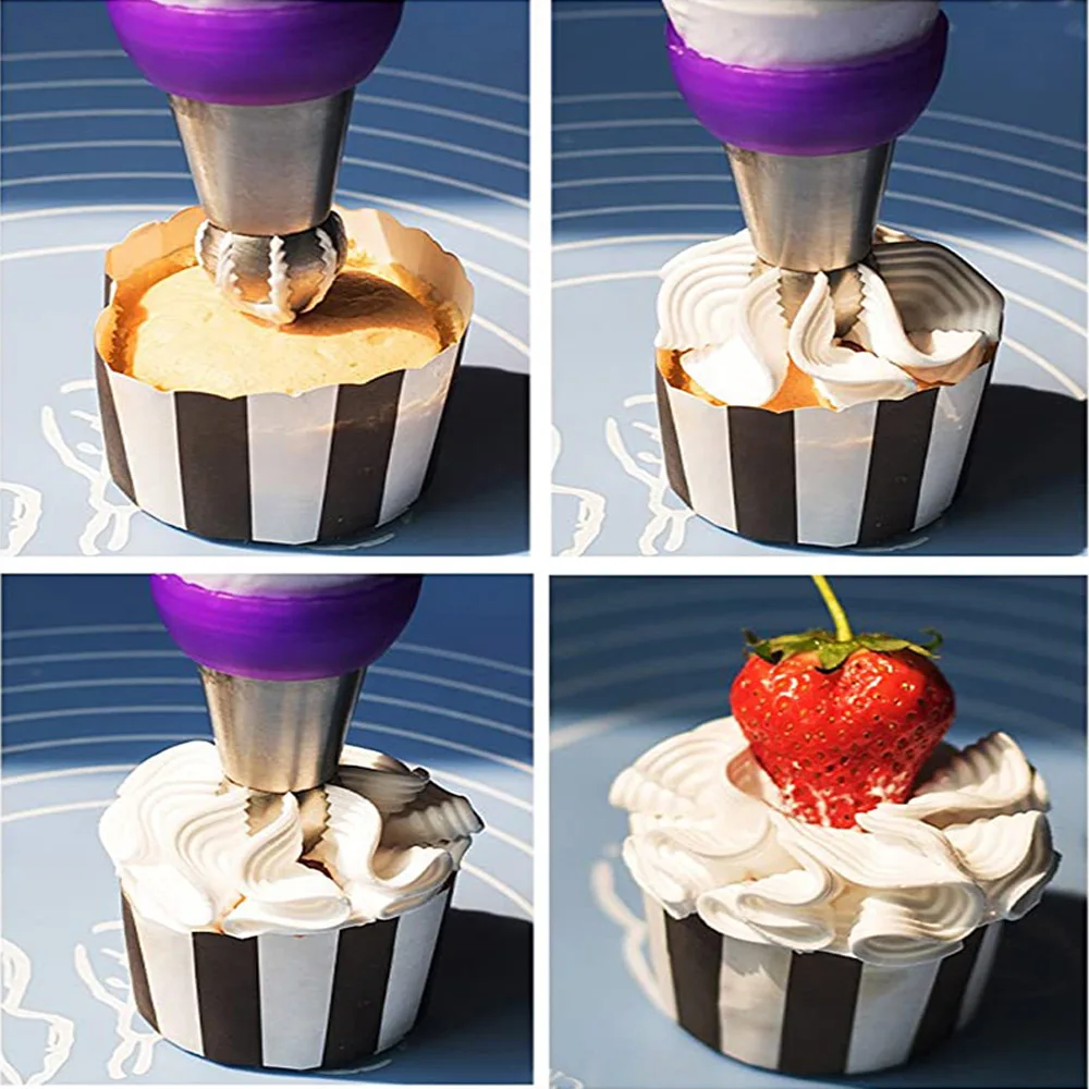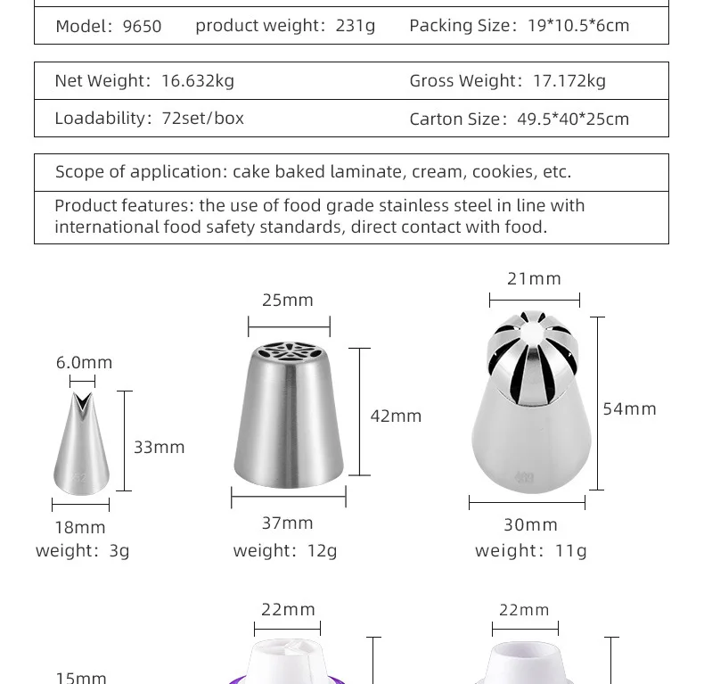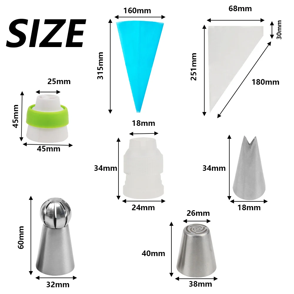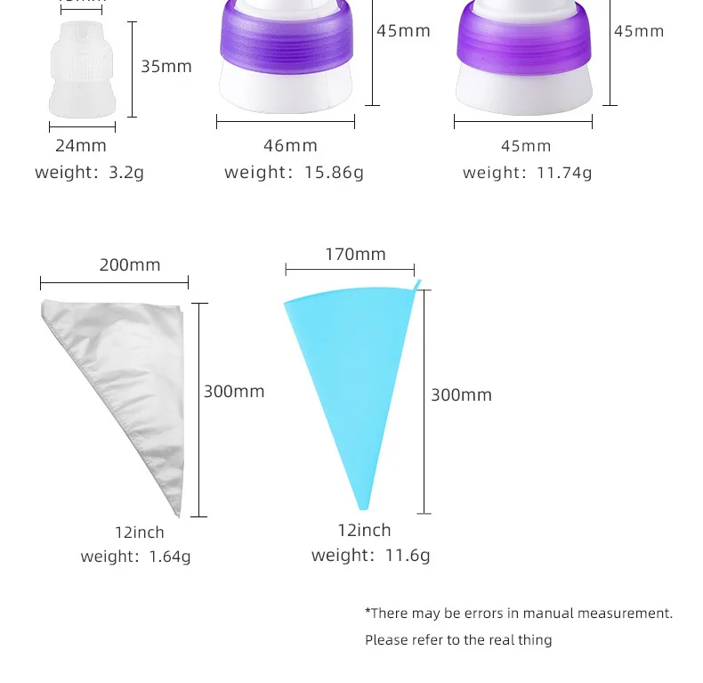 Посылка включает: 1 Набор инструментов для торта (12 насадок для глазури + 1 зеленый муфта для цветочных насадок + 1 силиконовый пакет + 2 насадки в виде листьев + 1 маленький конвертер для насадки в виде листьев + 3 шариковых насадки + 1 фиолетовый муфта для шаровых сопел + 10 шт одноразовый мешок)