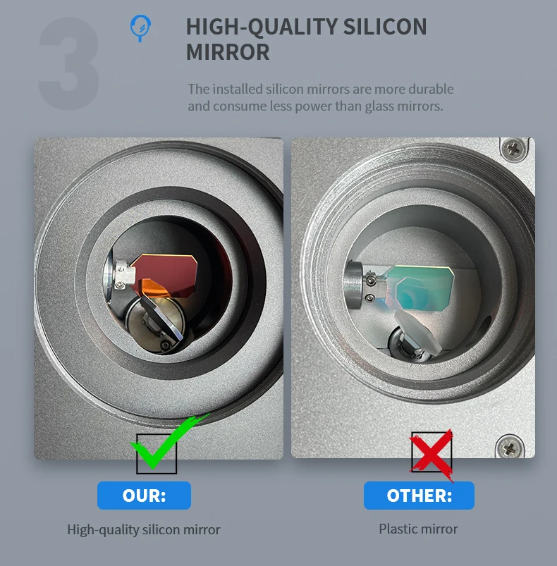 Зеркала Si установлены, что более долговечно и меньше снижает мощность, чем стеклянные зеркала. Это примерно в 10 раз прочнее, чем стеклянные зеркала. Но стоимость дороже, чем у стекла. Тем не менее, эффект отражения очень продвинутый, чем стеклянные зеркала.