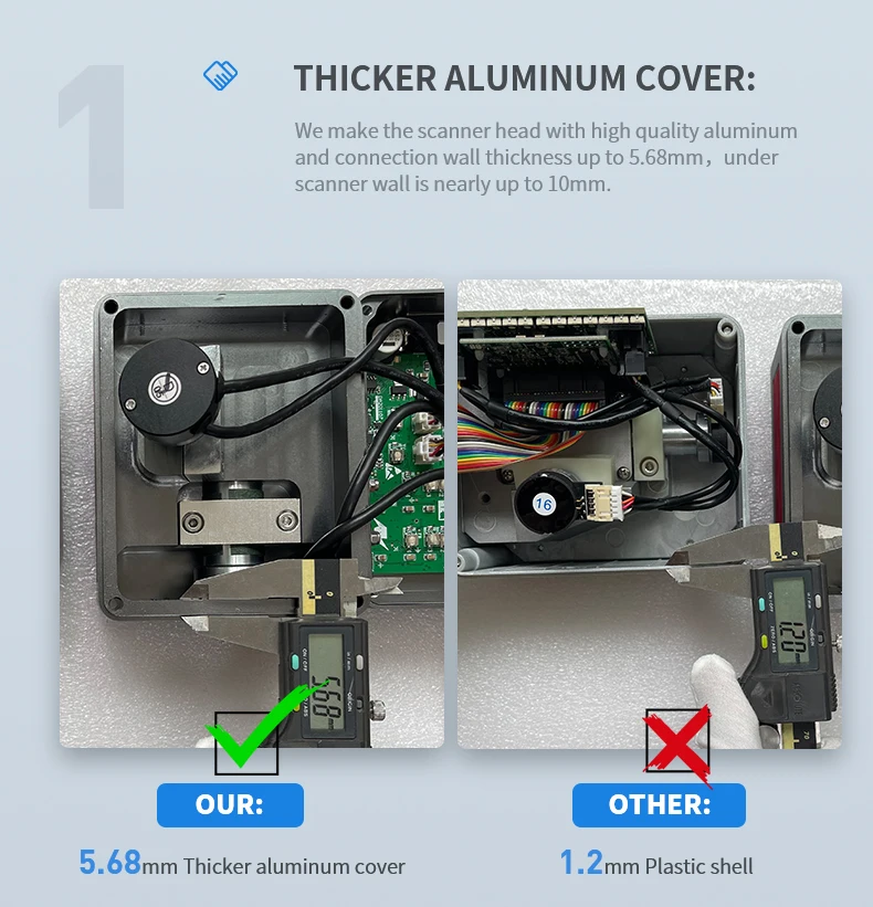 Мы производим головку сканера с высококачественным алюминием и толщиной соединительной стенки до 5,68 мм, другая стена сканера составляет всего около 1 мм.