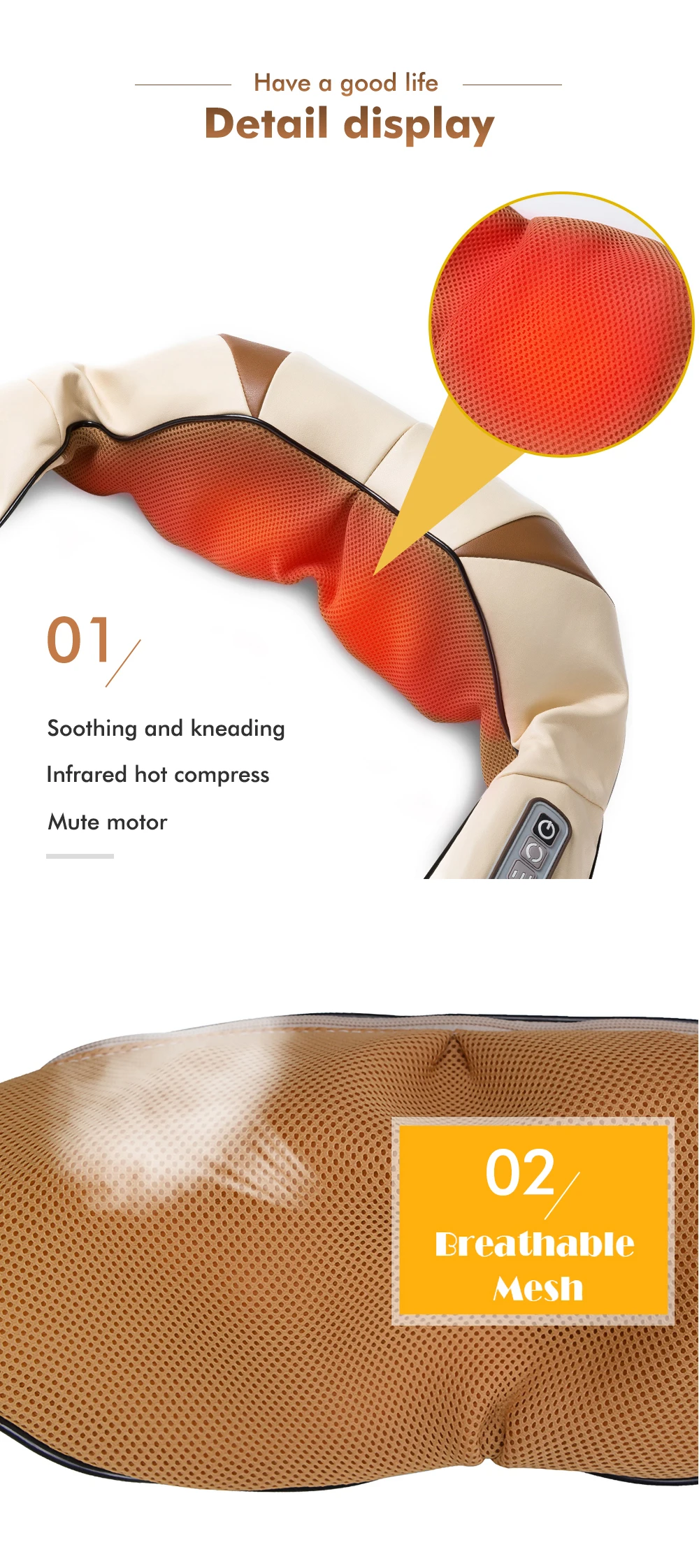 Использование композитного материала для максимальной прочности.Автоматическое переключение вперед и назад.Равномерное трехмерное разминание не нужно регулировать.Высококачественная искусственная кожа и дышащая сетчатая ткань.Встроенный механизм предотвращения перегреваОтбивайте шаль сильным массажем, различные режимы регулировки, облегчайте боль, устраняйте усталость.Нагревательная физиотерапия, применимая для шеи, талии, спины, ног и других частей здравоохранения и физиотерапии.Используется для автомобиля и дома с настройкой автомобильного зарядного устройства.