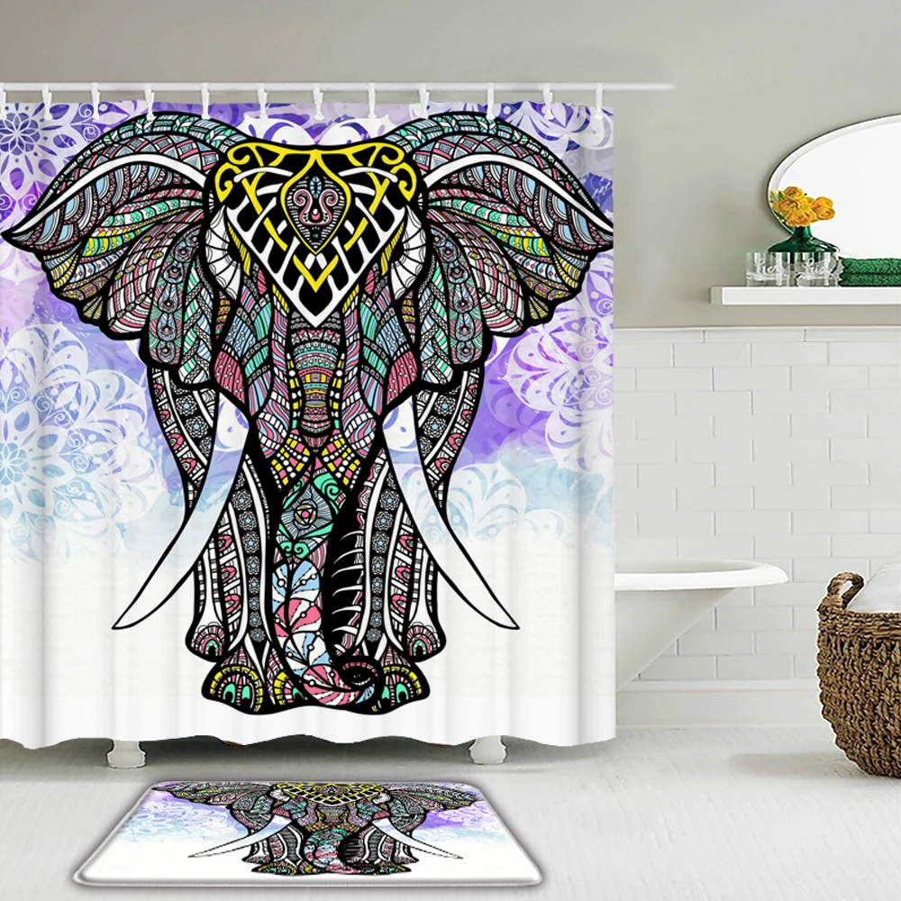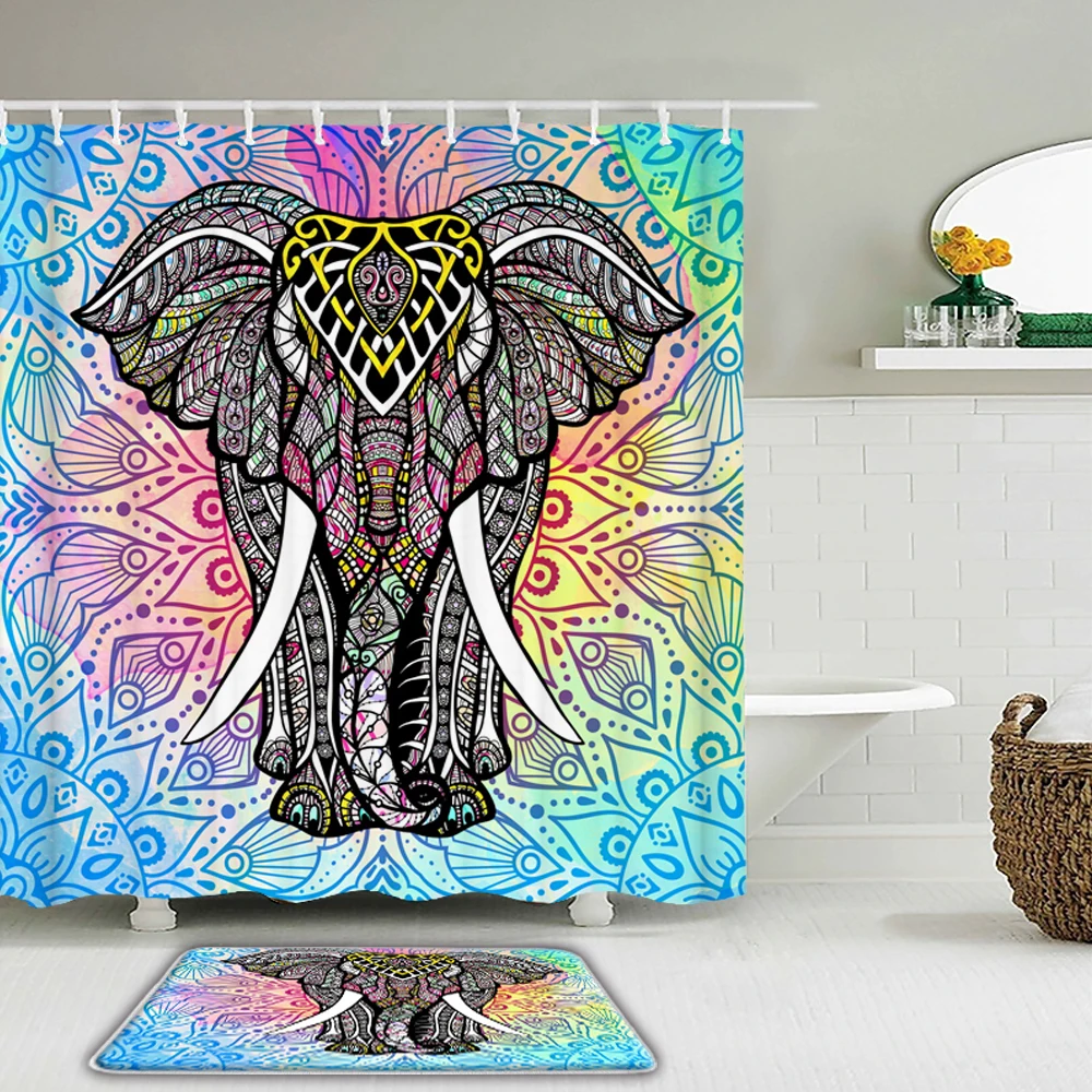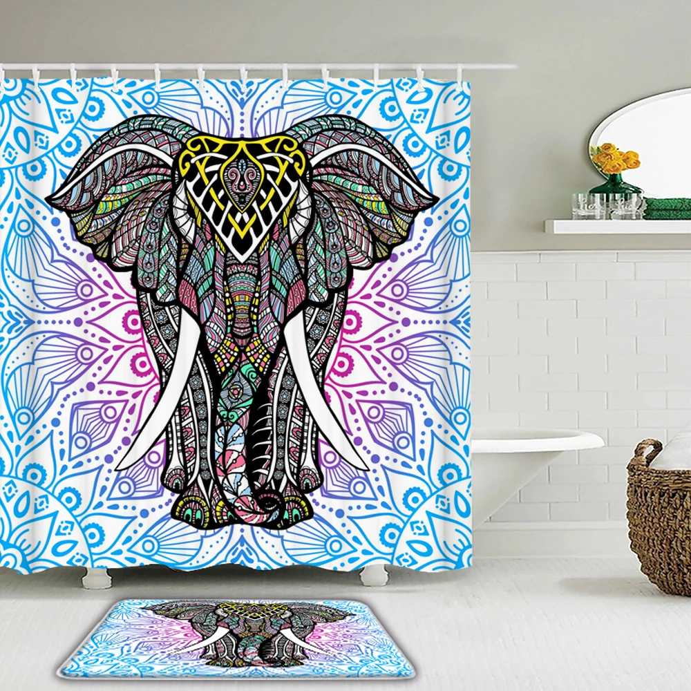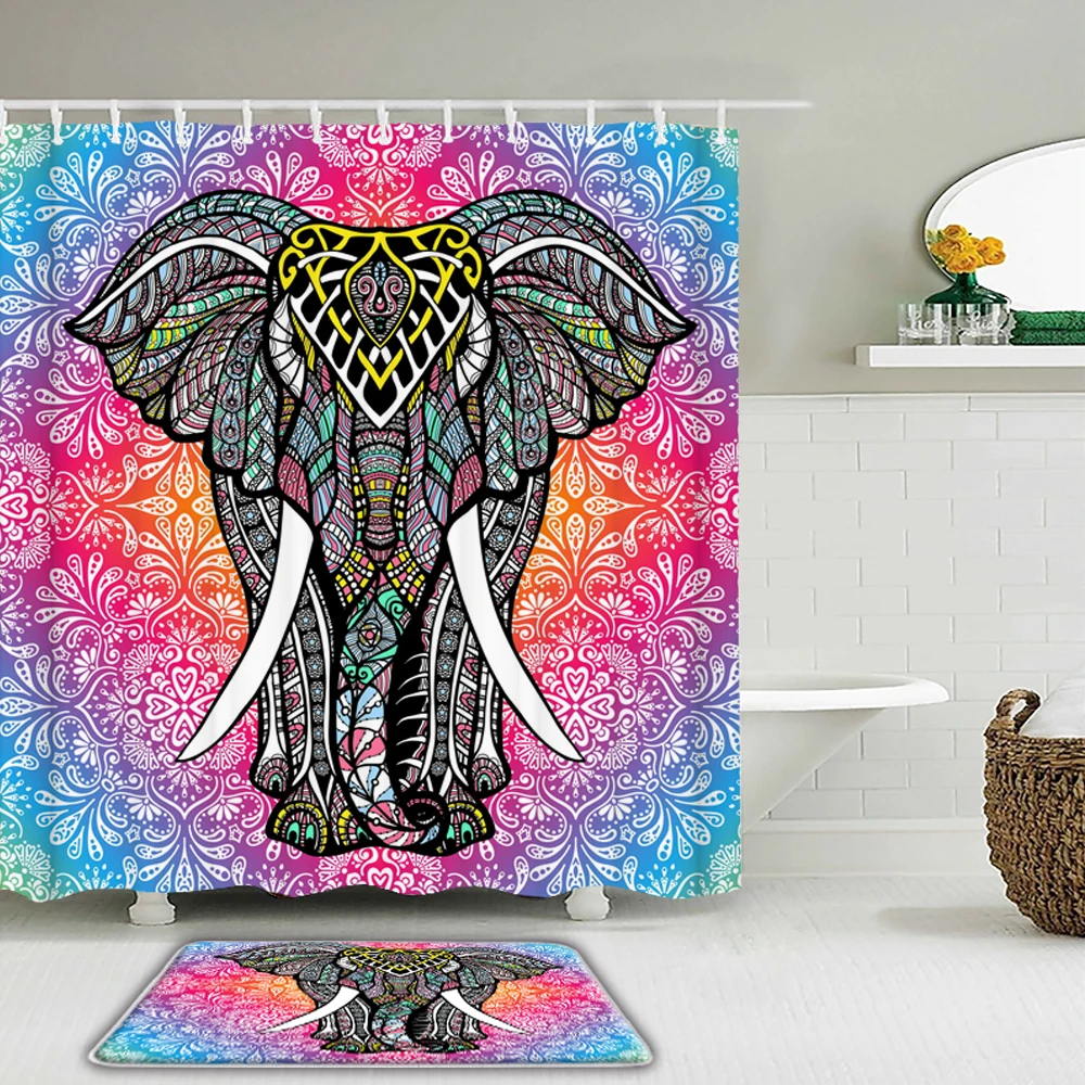 Занавеска для душа в богемном стиле с изображением индийского слона, 2 шт.компл., водонепроницаемая занавеска для ванной комнаты с крючками, нескользящий коврик для ванной комнаты, напольный коврик