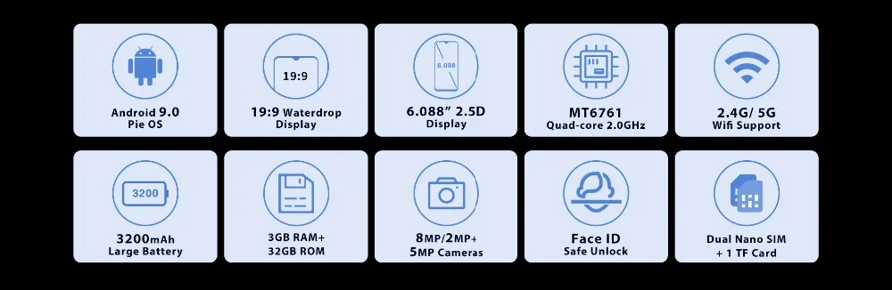 Расширение памяти: 256 ГБ Задняя камера: 8.0MP + 2.0MP Аккумулятор: 3200 мАч Sim-карта:Две sim-карты, два режима ожидания Особенности:GPS навигация, электронная почта, воспроизведение MP3, сенсорный экран,Bluetooth, Wi-Fi,Обновление и т. Д.