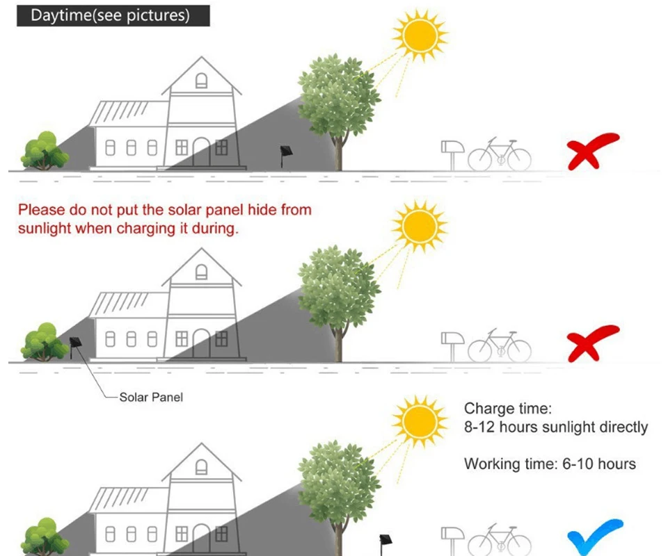 3. Эти огни не полностью заряжены по прибытии. ПожалуйстаПоложите их под солнце в течение 8-10 часов, чтобы получить полную зарядку перед первым использованием.