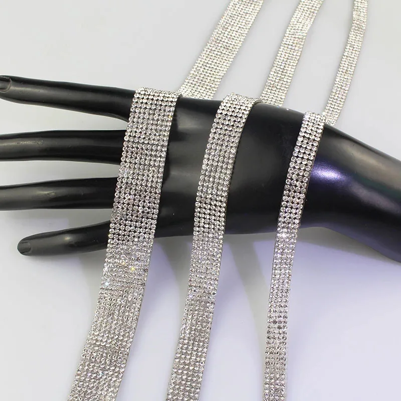 Характеристики: Материал: стразы Цвет: белый Длина: 1 ярд/90 см Ширина: 1 см, 1,5 см, 2 см, 2,5 см, 3 см Размер Стразы: 2 мм каждая