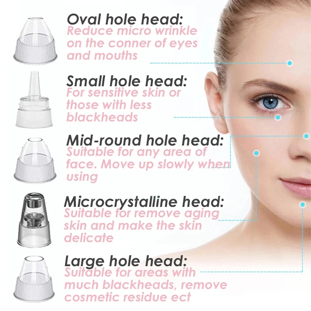 1. Есть Дополнительные режимы, большое всасывание для жирной кожи, средняя для сухой кожи, низкая для нормальной кожи. Одна ключевая операция.2. Четыре вида всасывающего наконечника для различного использования:A) большой круглый наконечник для удаления черных точек в области кончика носа;Б) овальный наконечник для удаления черных точек и подтяжки кожи и уменьшения жира;C) трубчатый круглый наконечник для удаления омертвевшей кожи и кутина, очистки пор;D) небольшой круглый наконечник для тонкой и деликатной области.3. Примечание: Пожалуйста, переместите устройство вверх и вниз, и не останавливайтесь в одном месте слишком долго, или кожа может повредиться.