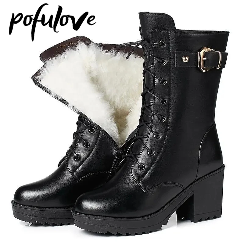 Pofulove женские зимние ботинки на высоком каблуке черные кожаные ботинки меховые тёплые ботинки обувь на квадратном каблуке ботинки до середины икры размеры 34-41