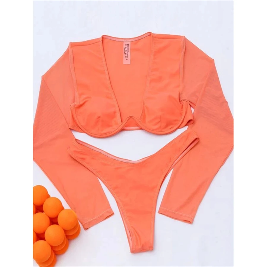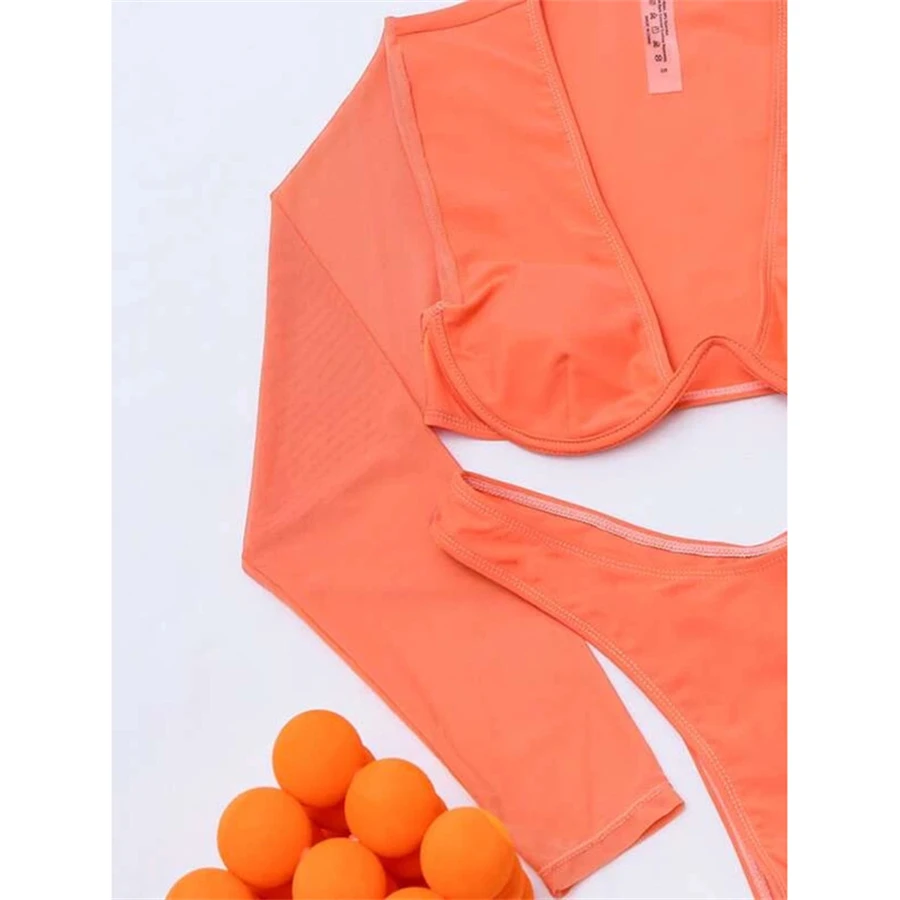 Сексуальный сетчатый купальник с длинным рукавом, женский купальник, неоново-оранжевый комплект бикини 2022, женская пляжная одежда с низкой талией, бикини