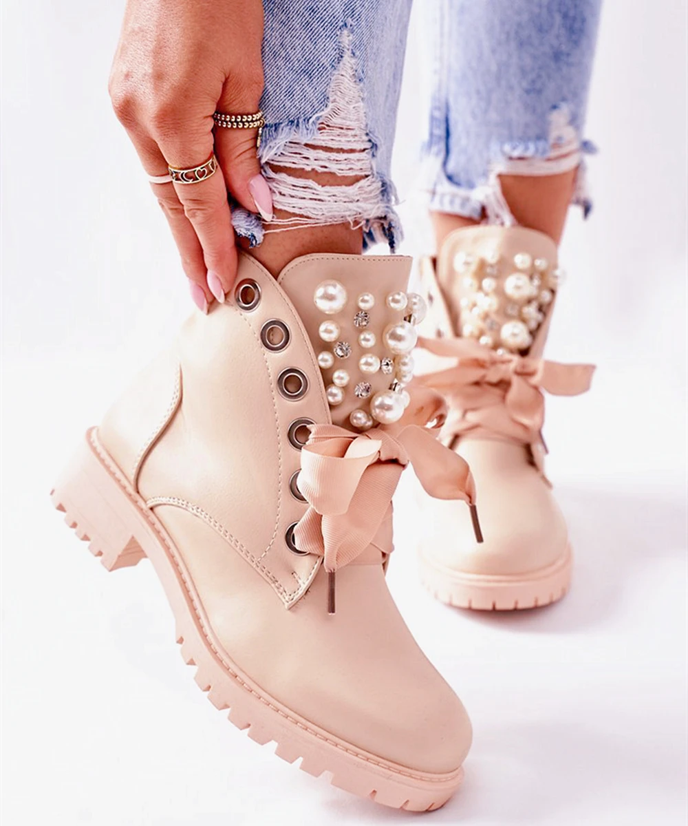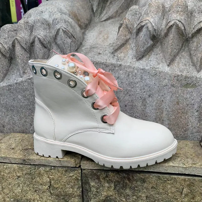 Женские ботильоны 2022, Осенние мотоциклетные ботинки из искусственной кожи на шнуровке, украшенные жемчугом, повседневная обувь, женские ботинки с круглым носком, женская обувь