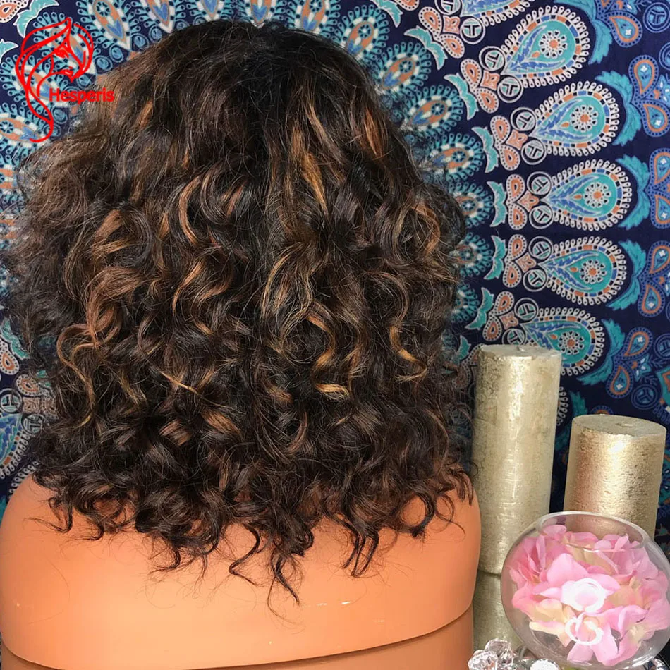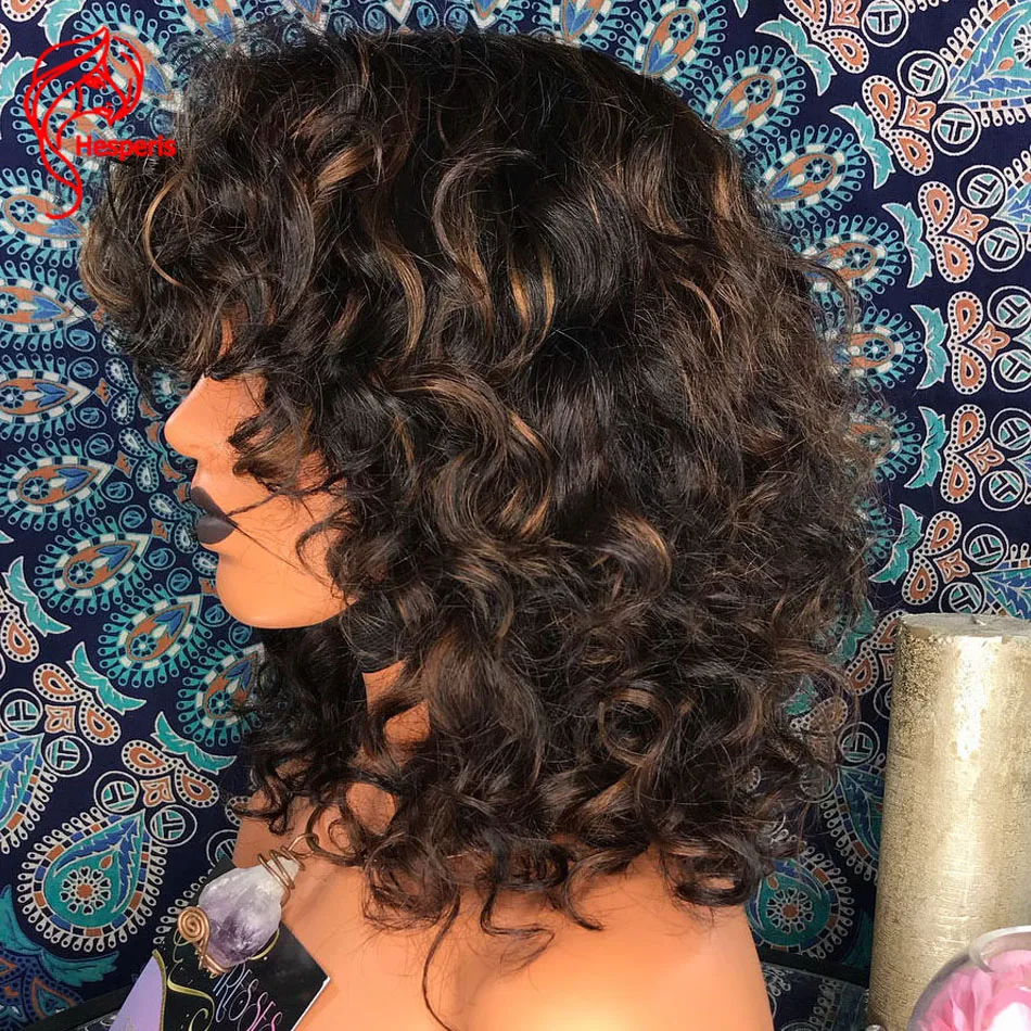 Хайлайтер Hesperis, короткие кудрявые парики боб с челкой, Remy, бразильские полноразмерные волосы для кожи головы, хайлайтер, кудрявые человеческие волосы, парики