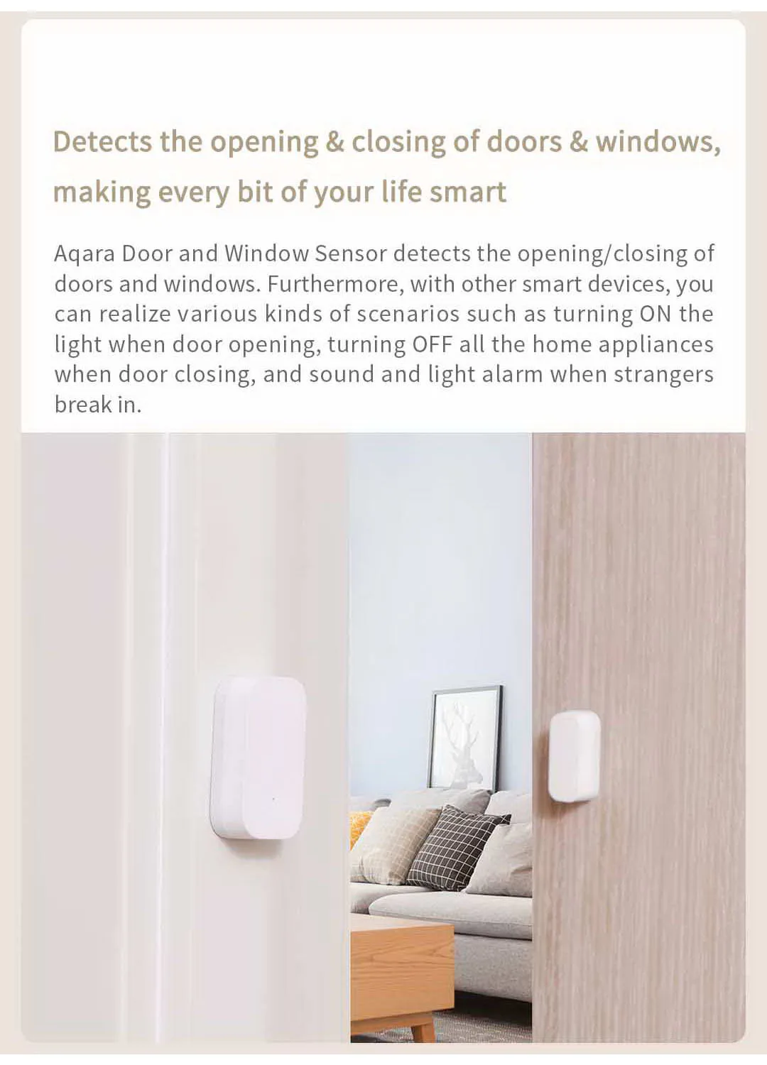 Датчик двери Aqara smart windows может обнаруживать открытие и закрытие дверей и окон и отправлять уведомление на ваш телефон через приложение. С возможностью соответствия с другими смарт-устройствами, такими как пульт дистанционного управления шлюзом, умная лампа, очиститель воздуха и т. д. этот датчик может помочь вам создать умный дом. Датчик двери окна состоит из датчика и магнита. Он обнаруживает открытие и закрытие дверей и окон, обнаруживая близость и разделение объекта датчика и магнита.