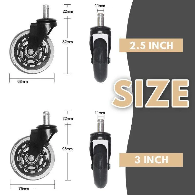 В отличие от пластиковых колесиков, эти высококачественные Мягкие колеса из ПУ Не повреждает пол любого типа. Эти колеса прослужат дольше, чем ваши средние колесики для офисного кресла.