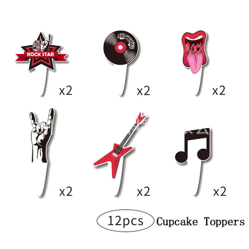 Посылка:* 1 Набор «С Днем Рождения» баннер,* 12 шт топперов для кексов,* 2 шт. гитара Алюминиевая фольга шар,* 12 шт 12-дюймовые латексные шары.