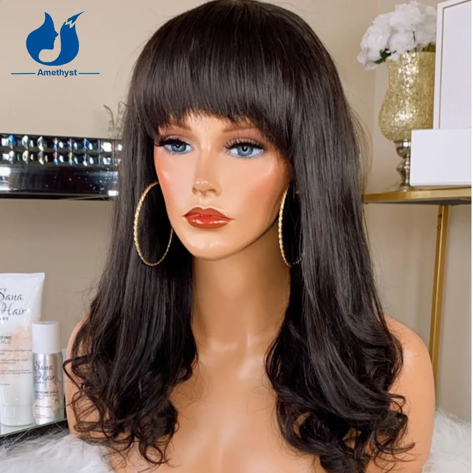 Парик с аметистовым натуральным кутикулом, машинка для париков из человеческих волос с челкой, бразильские волосы без повреждения кутикулы, волнистые волосы для чернокожих женщин