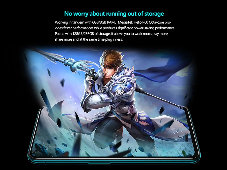 ЦП:MT6771 Helio P60, Восьмиядерный, ARM Mali- G72 MP3 GPU