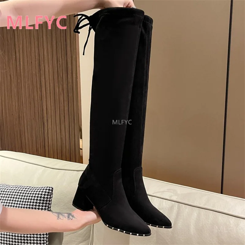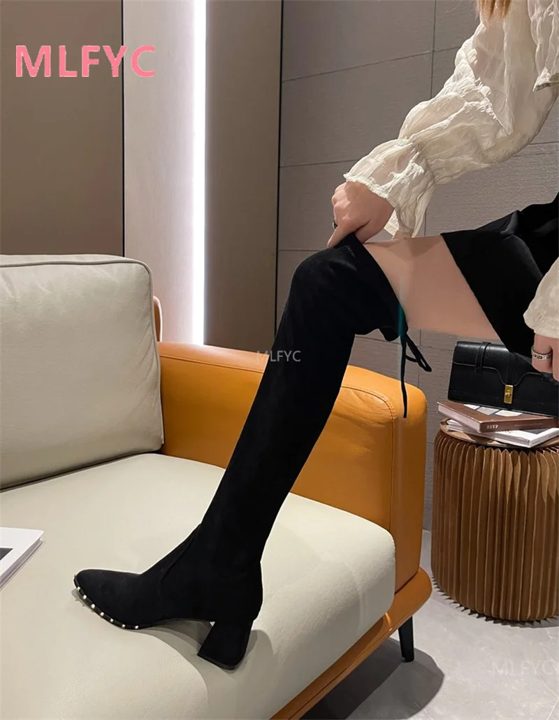 Женские сапоги выше колена Новинка Осень-зима 2021 Бархатные Высокие эластичные сапоги на толстом каблуке женские длинные сапоги на высоком каблуке