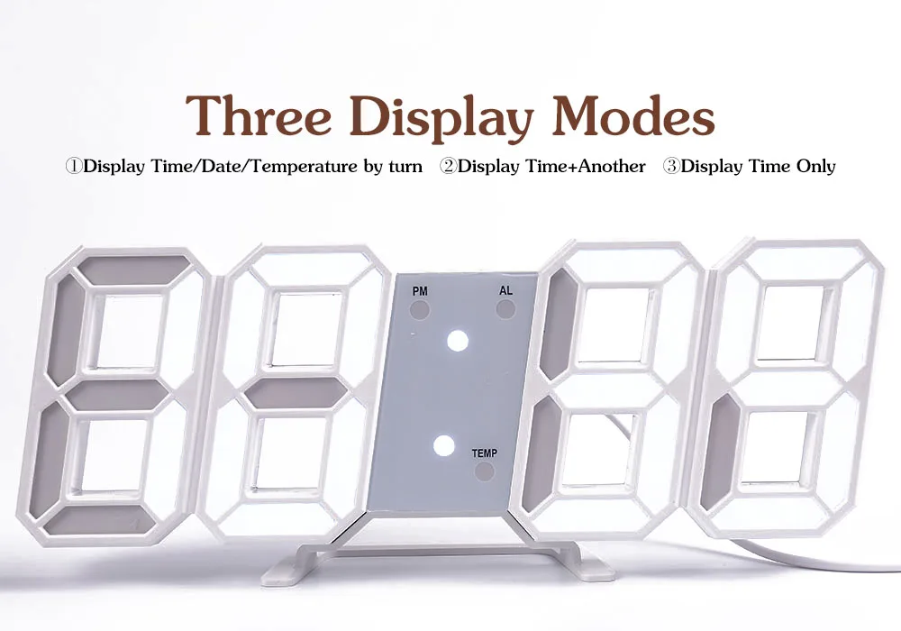Светодиодный настенный цифровой будильник с датой температуры и автоматической подсветкой Настольный украшения для дома стенд настенные часыОсобенности:Технология материала высокой плотности и акрилБольшой цифровой дисплей, дистанционное управление, возможность считывания на дальние расстояния.Есть три режима. 12 или 24 часовой дисплей, может быть переключен, по умолчанию 24 часа; Отображение дня/даты, отображение температуры, 3 группы сигнализации, Ночной светильник.Светодиодные часы подходят для любой комнаты, гостиной, спальни, офиса, кафе, тренажерного зала и так далее.Светодиодные часы должны подключаться. Вы можете спрятать провод питания за некоторыми предметами или в стену, это будет более красиво, чтобы украсить ваш дом.Шаги операции:Настройка: Нажмите и удерживайте три секунды, чтобы ввести настройки:Введите 12/24 часовую регулировку и нажмите вверх/вниз, чтобы переключиться.Нажмите вверх/вниз, чтобы настроить, нажмите вверх/вниз, чтобы настроить, нажмите вверх/вниз, чтобы быстро двигаться вперед или назад;Нажмите на набор, чтобы настроить время и дату работы одновременно.Нажмите на набор, чтобы выключить будильникКогда набор входит в будильник, конкретная операция настраивается одновременно.Нажмите на набор, чтобы настроить будильник и настроить работу одновременно.Описание товара:Название продукта: 3D светодиодный настенные цифровые часы.Вес: около 190 грамм.Размер: 225 мм * 85 мм * 17 ммМатериал: акрилДиапазон температур: 0-50 ℃(32-122 ℃)Цвет: черный, белыйСветильник: синий светильник, белый светильник. Красный светильник, розовый правый, зеленый светильникВложение: используйте руководство по эксплуатации, шнур питания USB.Источник питания: USBВыходное напряжение: 5 В постоянного токаВходное напряжение: 100-240 ВПосылка включает в себя:1 * Светодиодные настенные часы1 * USB разъем питания1 * Руководство пользователя