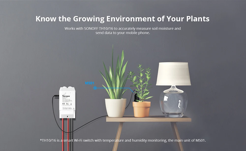 MS01 является аксессуаром TH10/TH16, работает с SONOFF TH10/16, чтобы точно измерить влажность почвы и отправить данные на ваш мобильный телефон. MS01 может поливать регулярно и проверять влажность почвы в любое время и в любом месте, чтобы вырасти ваши цветы более здоровыми.