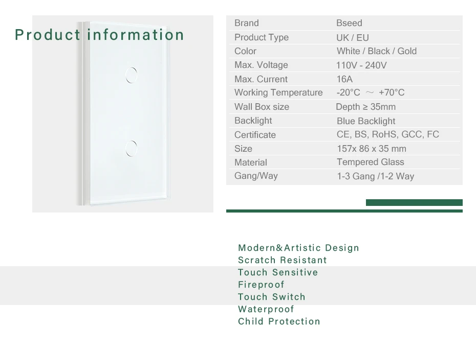 Сенсорный выключатель Bseed 2 Gang, 157 мм, 1 канал, 2 канала свети...