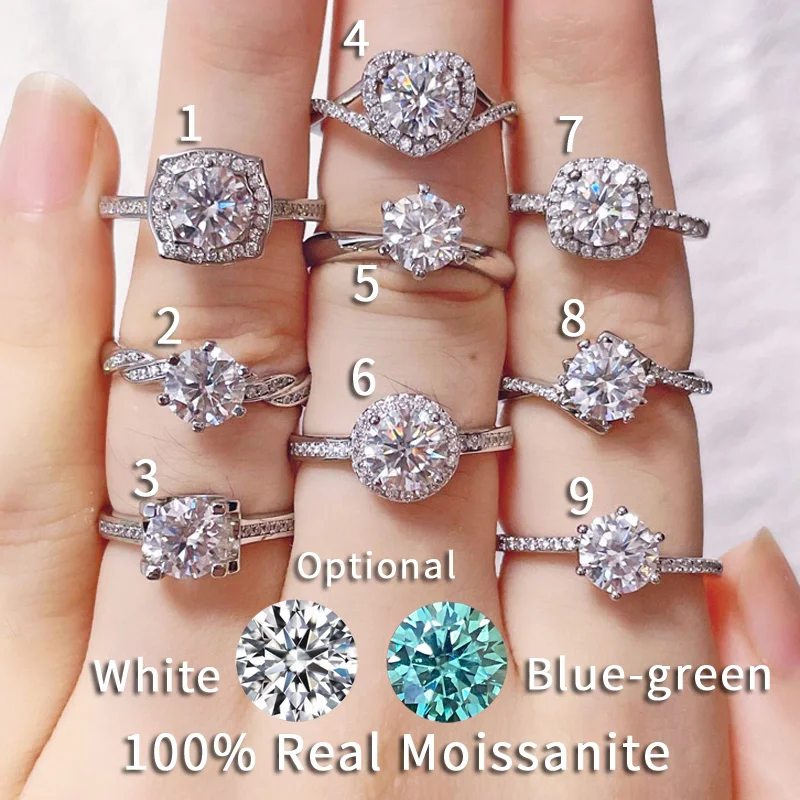 Кольцо из 100% настоящего муассанита для женщин 0,5-2CT 2022 г., новый трендовый цвет, голубые, синие, с бриллиантами, кольца из стерлингового серебра, белое золото 14 карат