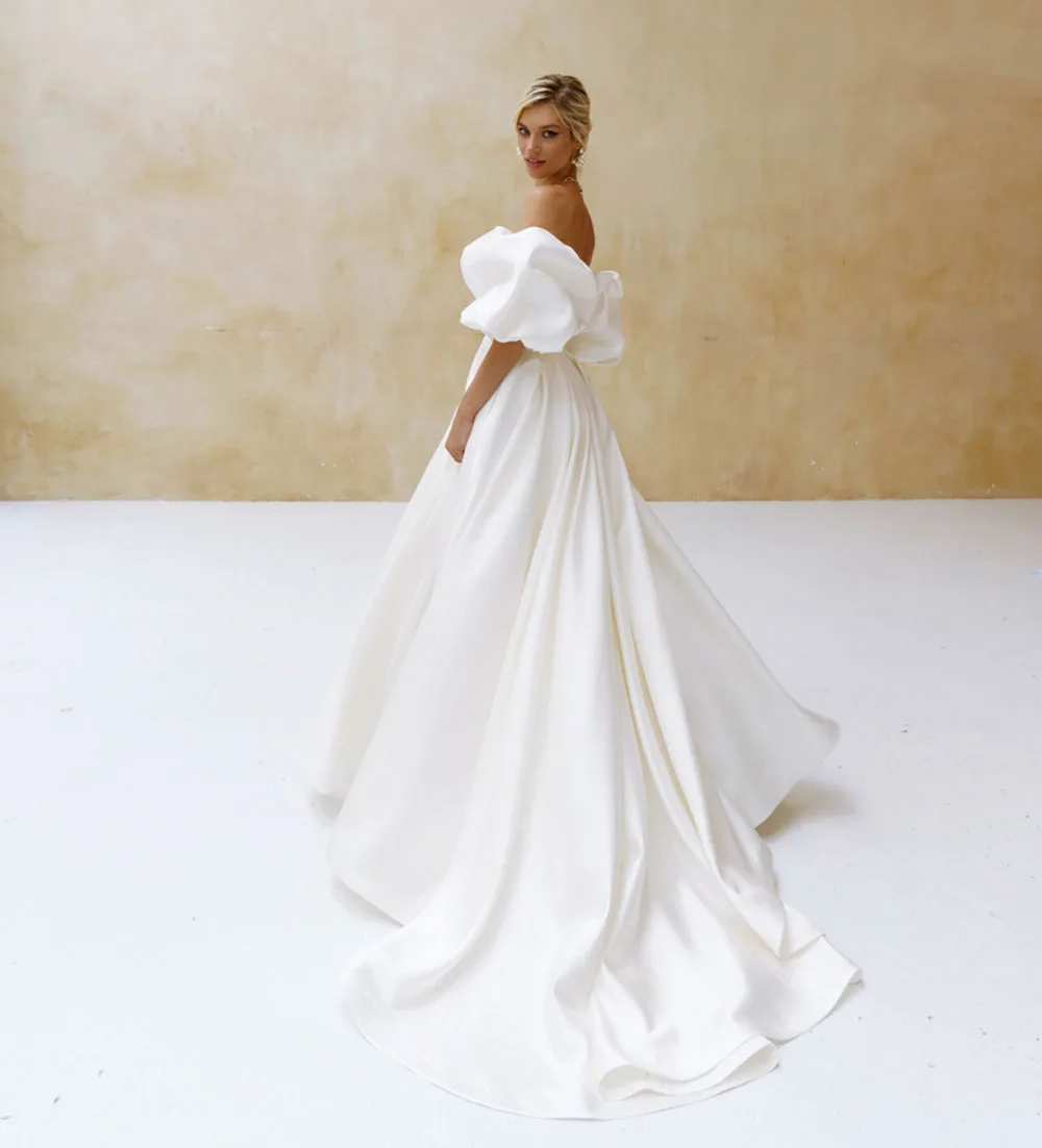 Платье свадебное атласное с V-образным вырезом и рукавами-крылышками