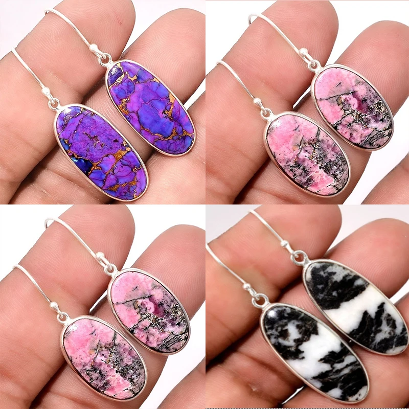 Богемные овальные серьги-подвески с розовым камнем, винтажные сереб...
