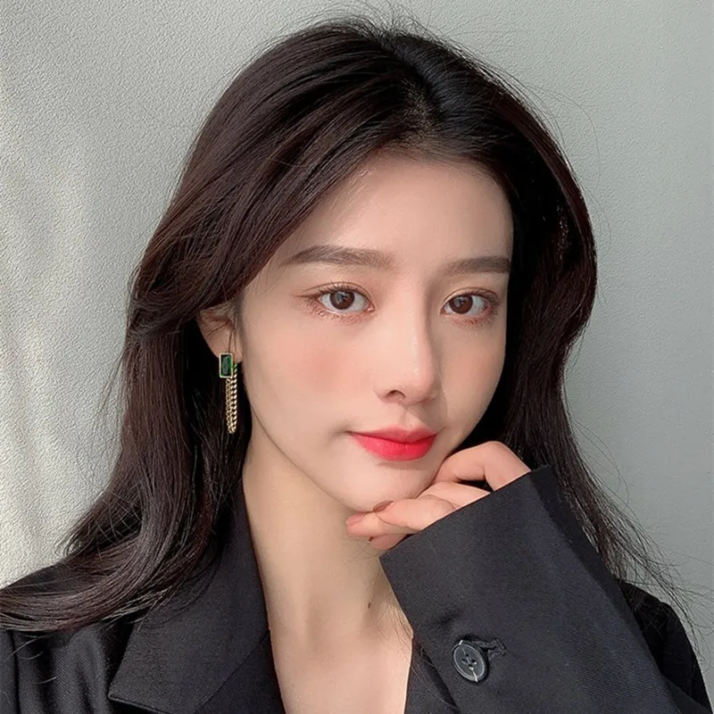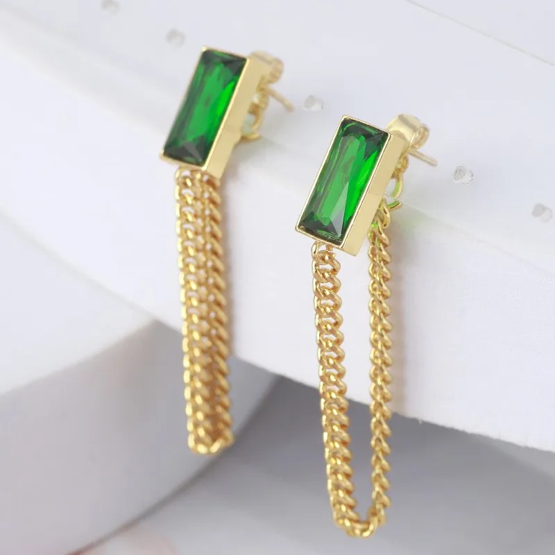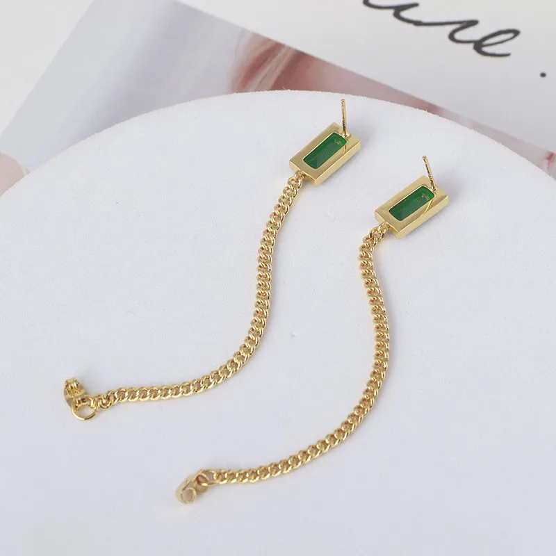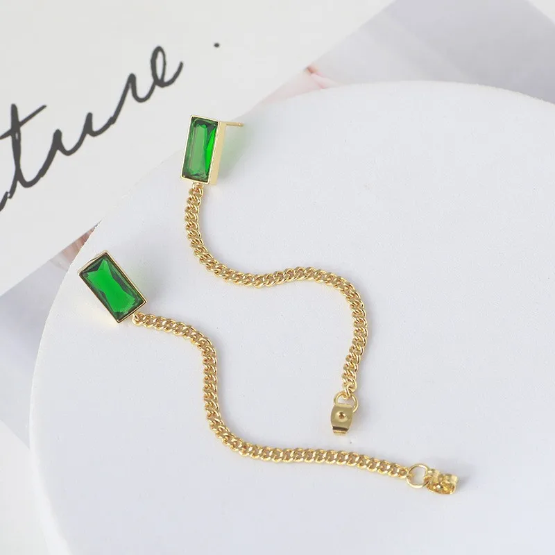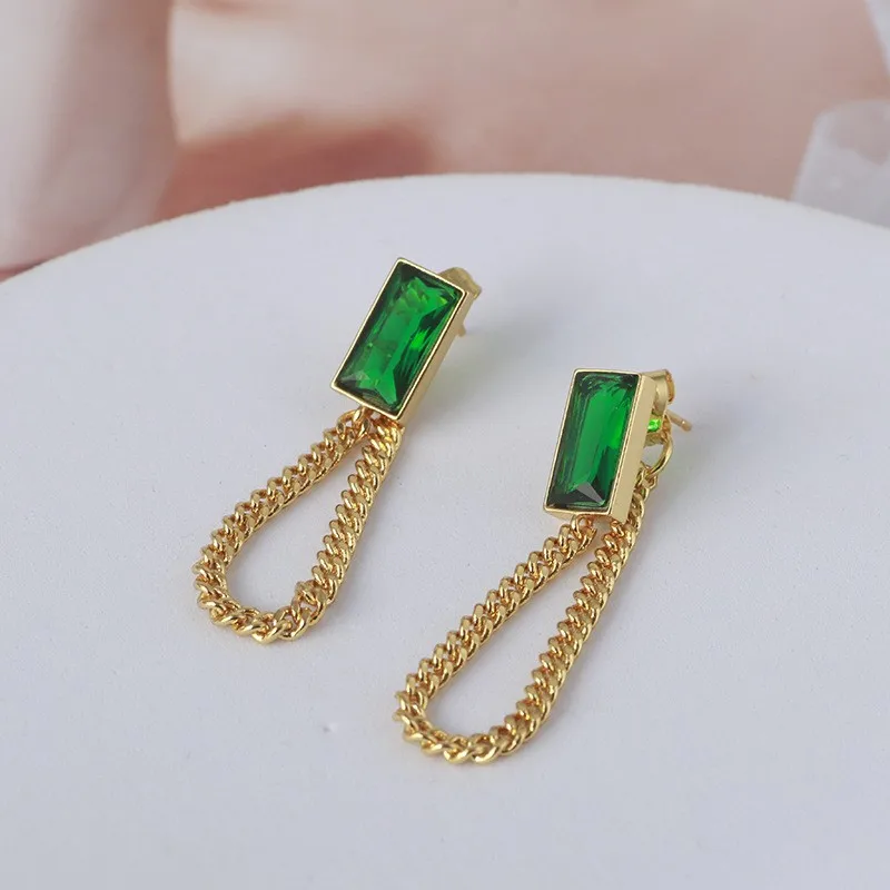 Новинка 2021, классические геометрические висячие серьги с зелеными кристаллами, металлическая цепочка, длинные висячие женские серьги-подвески