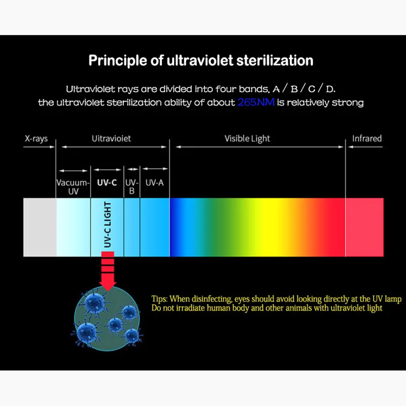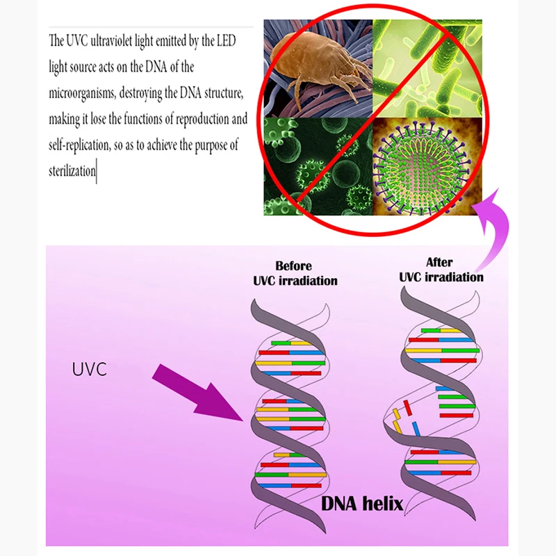 Особенности:UVC стерилизация имеет самый широкий спектр, она может эффективно убить все бактерии и вирусы, UVC led не будет производить озон, без ртути, без вторичного загрязнения, это действительно безопасно и Экологически безопасно, он может очищать органические загрязнители эффективно удаляет формальдегид и другие органические загрязнители в воздухе, удаляет запах,
