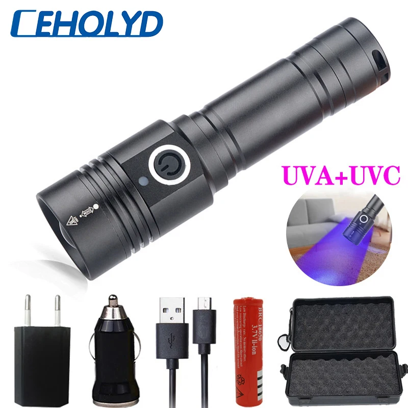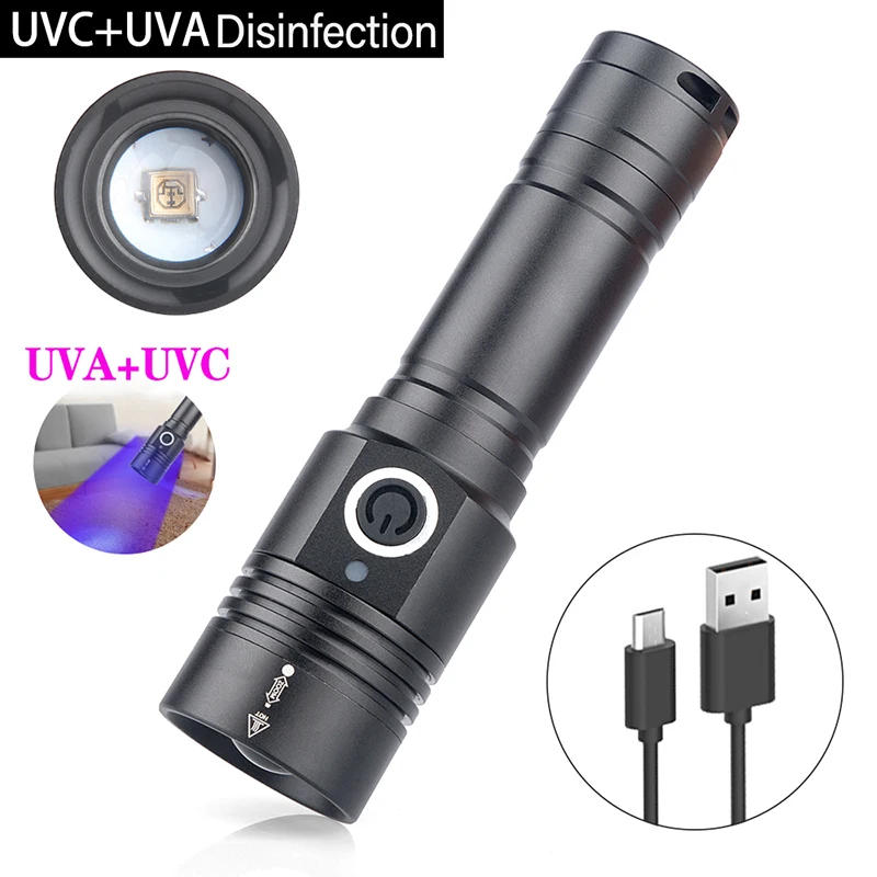 Портативный светодиодный фонарик UVA UVC, масштабируемый фонарик, перезаряжаемый аккумулятор 18650, водонепроницаемая лампа для стерилизации, лампы для дезинфекции масок