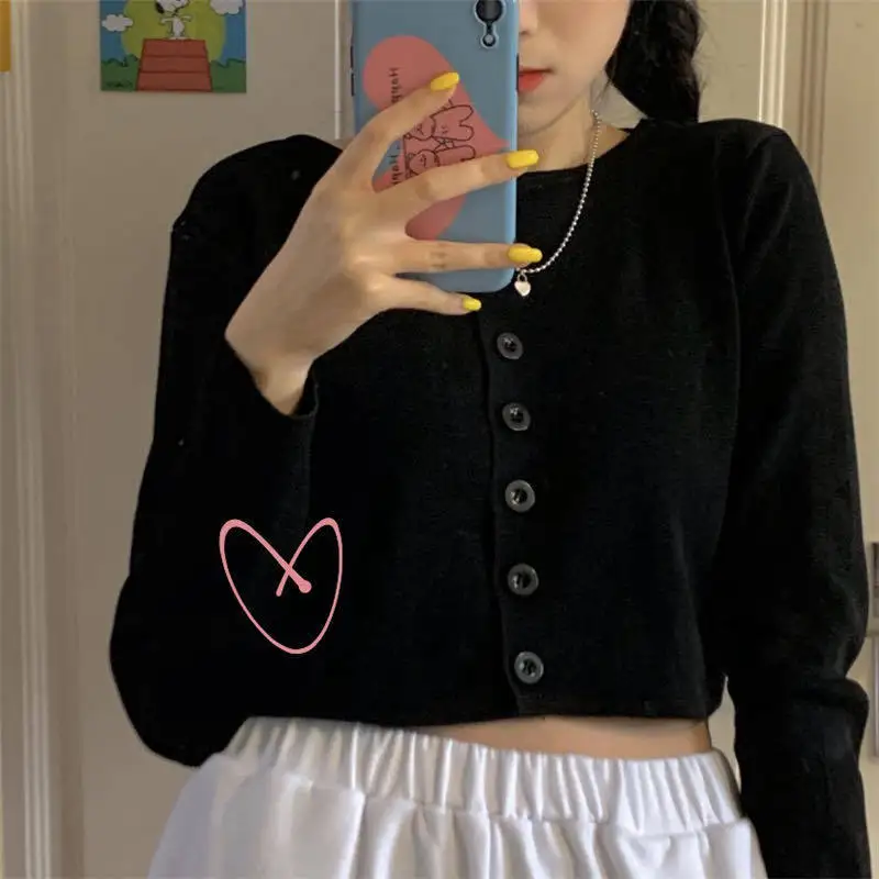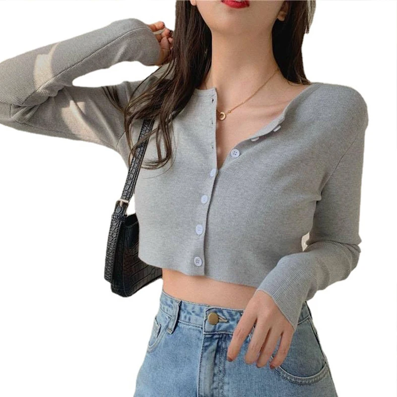 Корейский Модный укороченный топ, женские осенние вязаные свитера с круглым вырезом, Модный повседневный тонкий кардиган, женский с длинным рукавом 2021