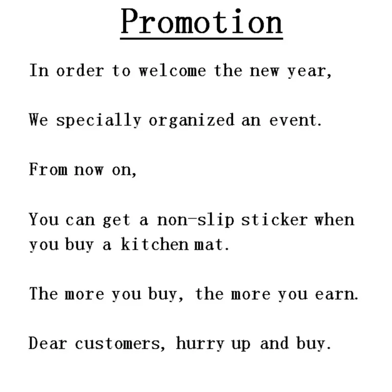 Для того, чтобы приветствовать новый год, мы специально организовали мероприятие. С этого момента вы можете получить нескользящую наклейку, когда покупаете кухонный коврик. Чем больше вы покупаете, тем больше вы зарабатываете. Уважаемые покупатели, спешите и покупайте.